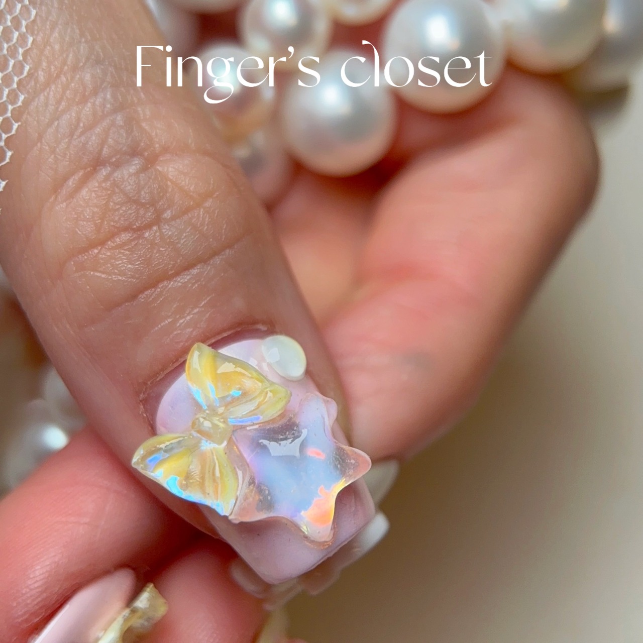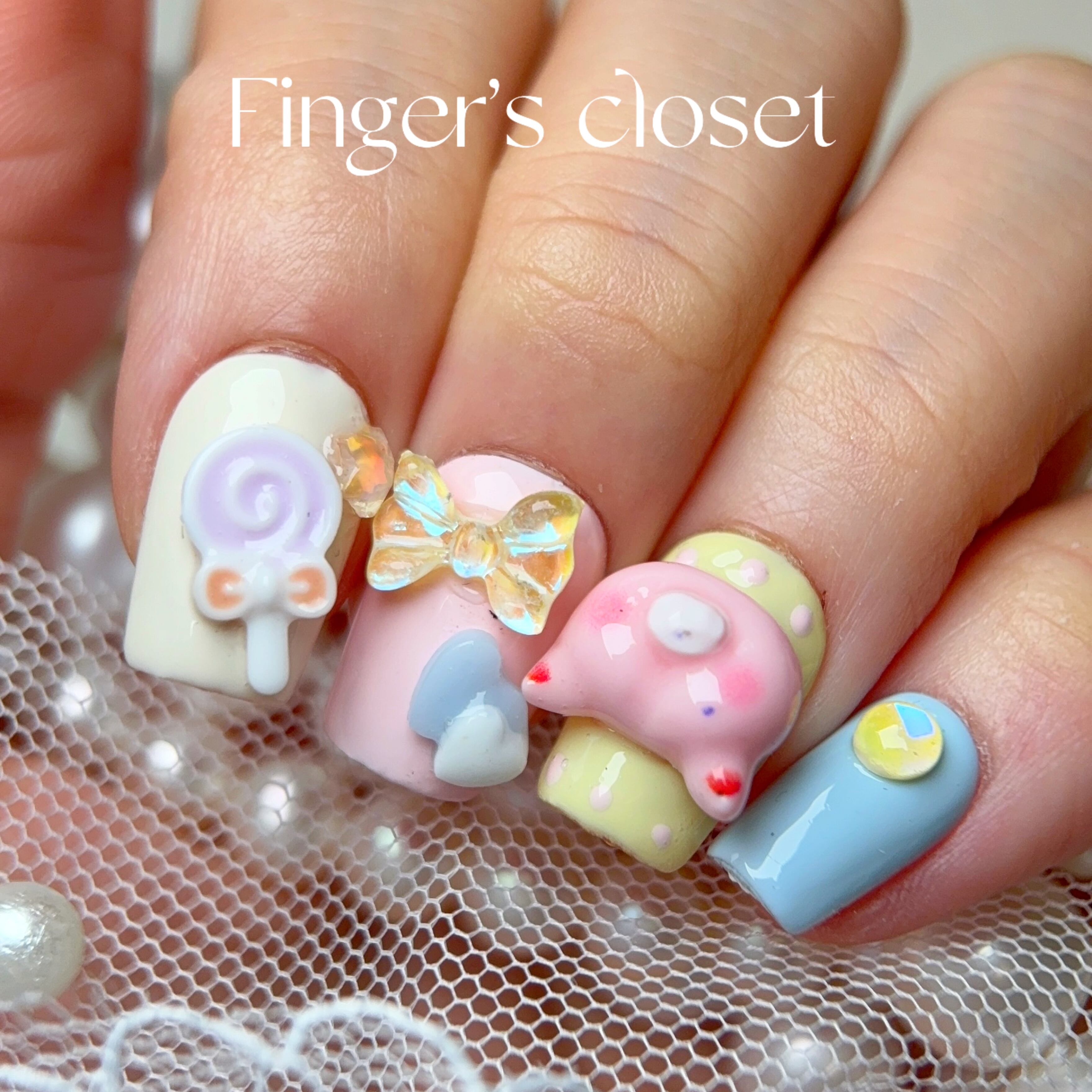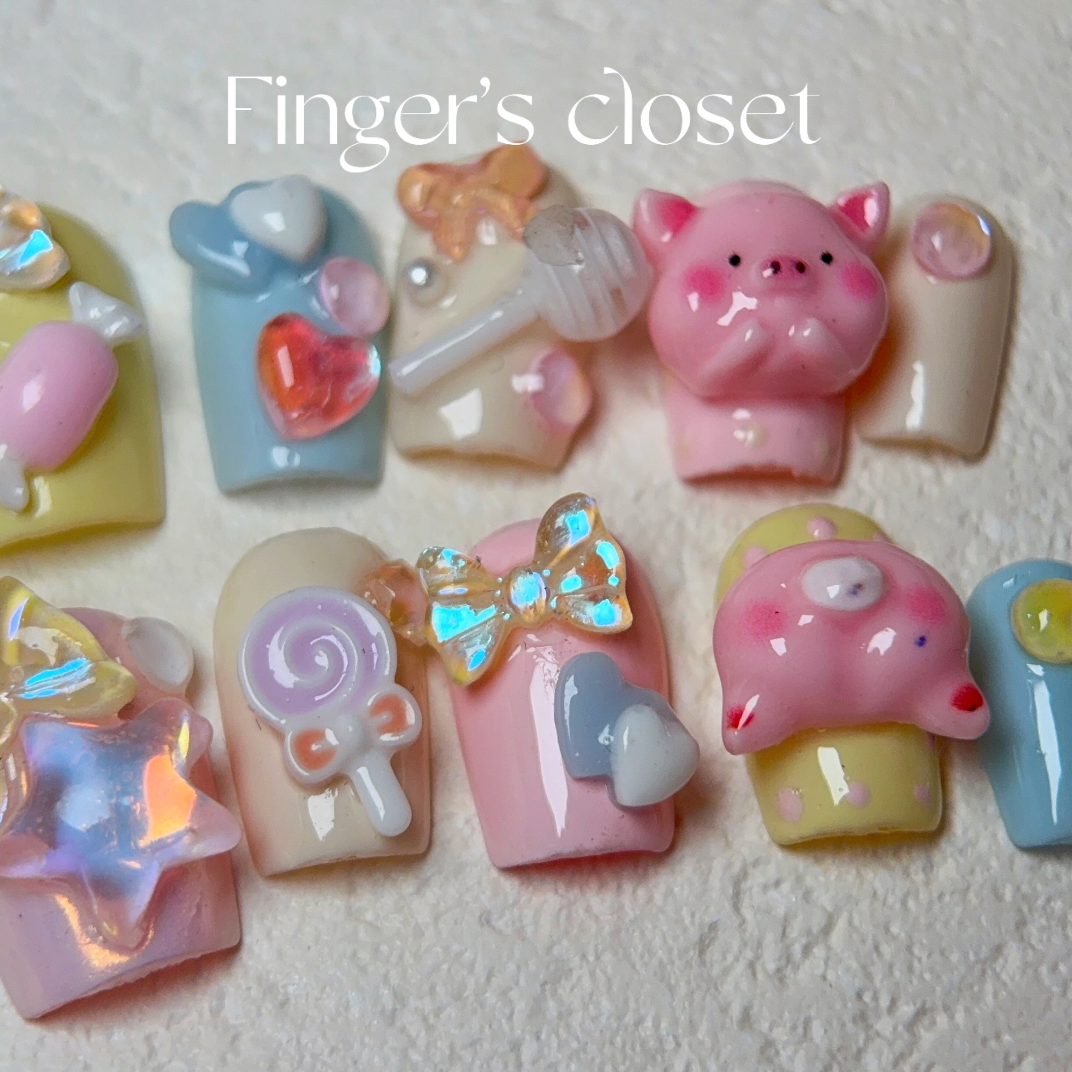 ぶたちゃん、リボン、キャンディなどをモチーフにした立体パーツと、淡いパステルカラーで仕上げた、夢のような指先をお楽しみいただけます。