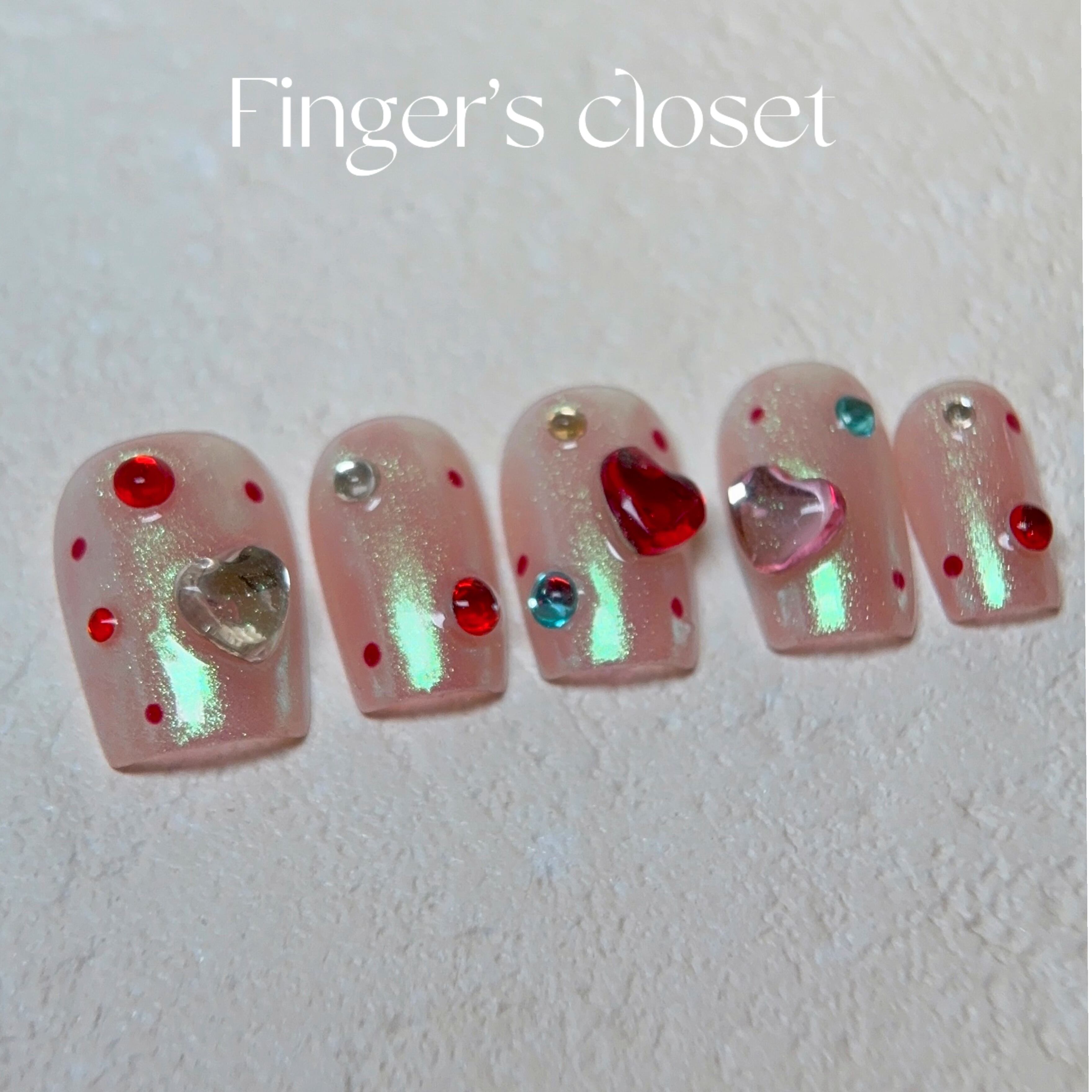 ぷっくりした立体ハートストーンと、赤・青・ゴールドのビジューをあしらい、指先にジュエリーのような輝きをプラス。
