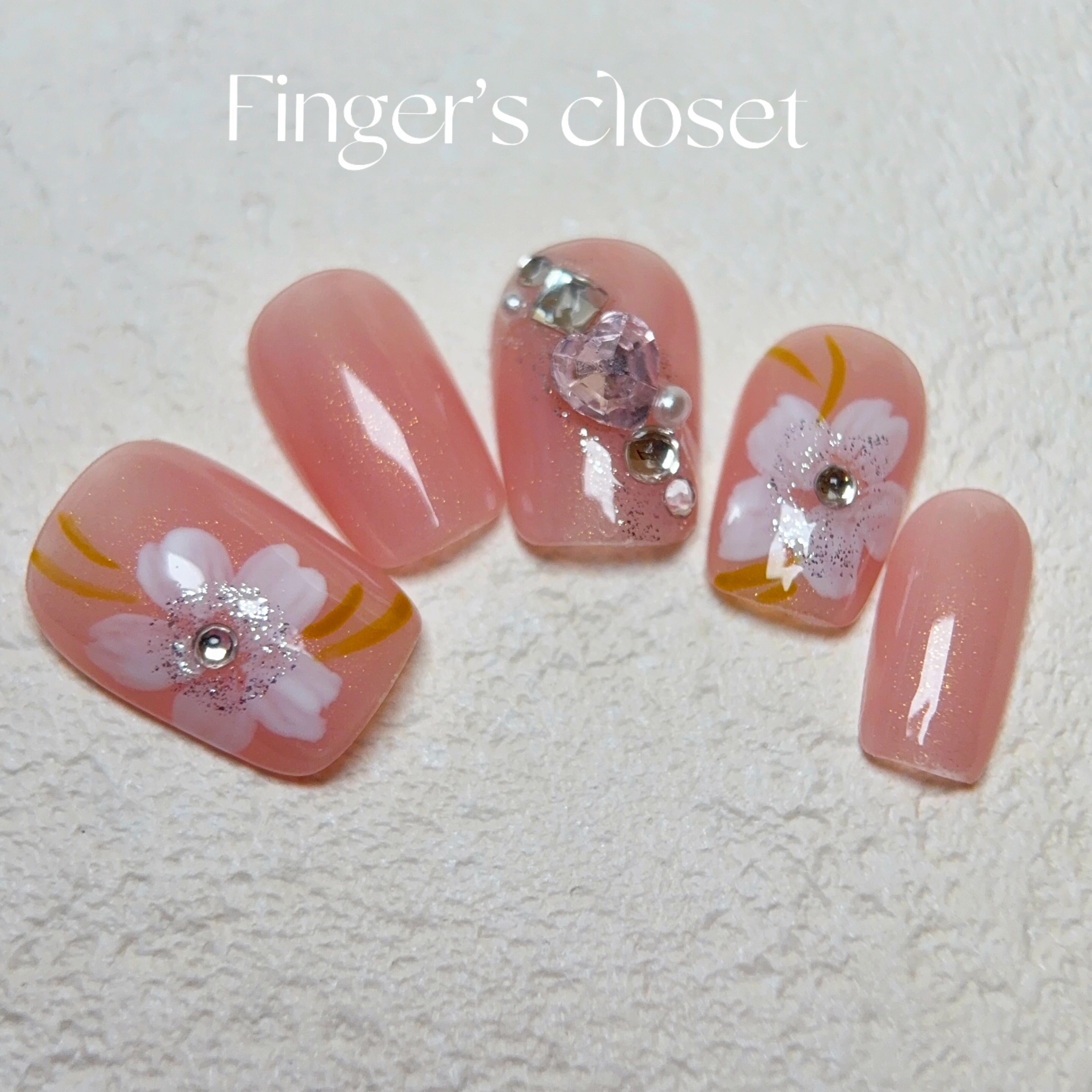 桜ピンク×白花アート×ビジューの上品ネイルチップセット 春の可憐デザイン