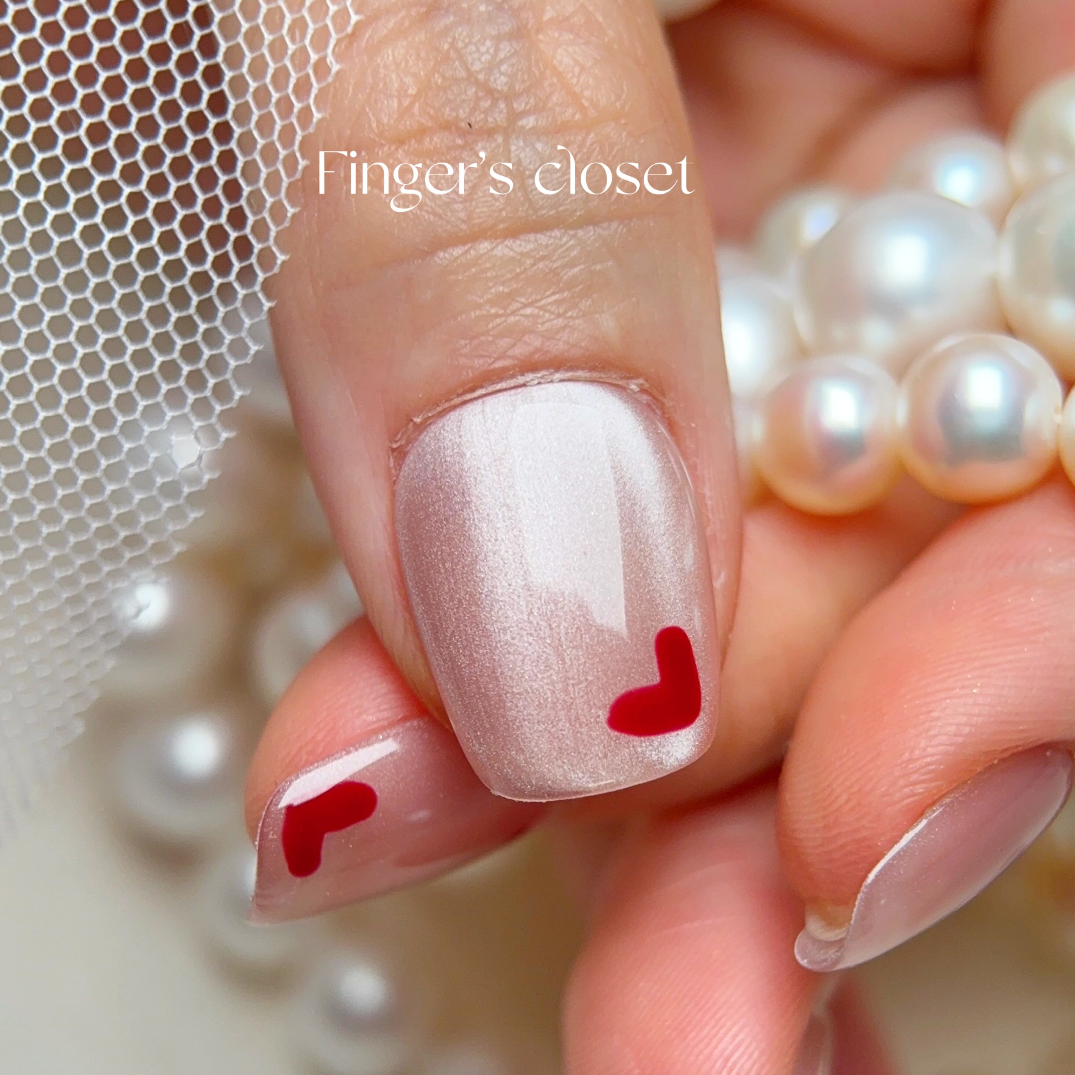 落ち着いたヌーディピンクに、小さく控えめな真紅のハートをアクセントにしたシンプルデザイン。