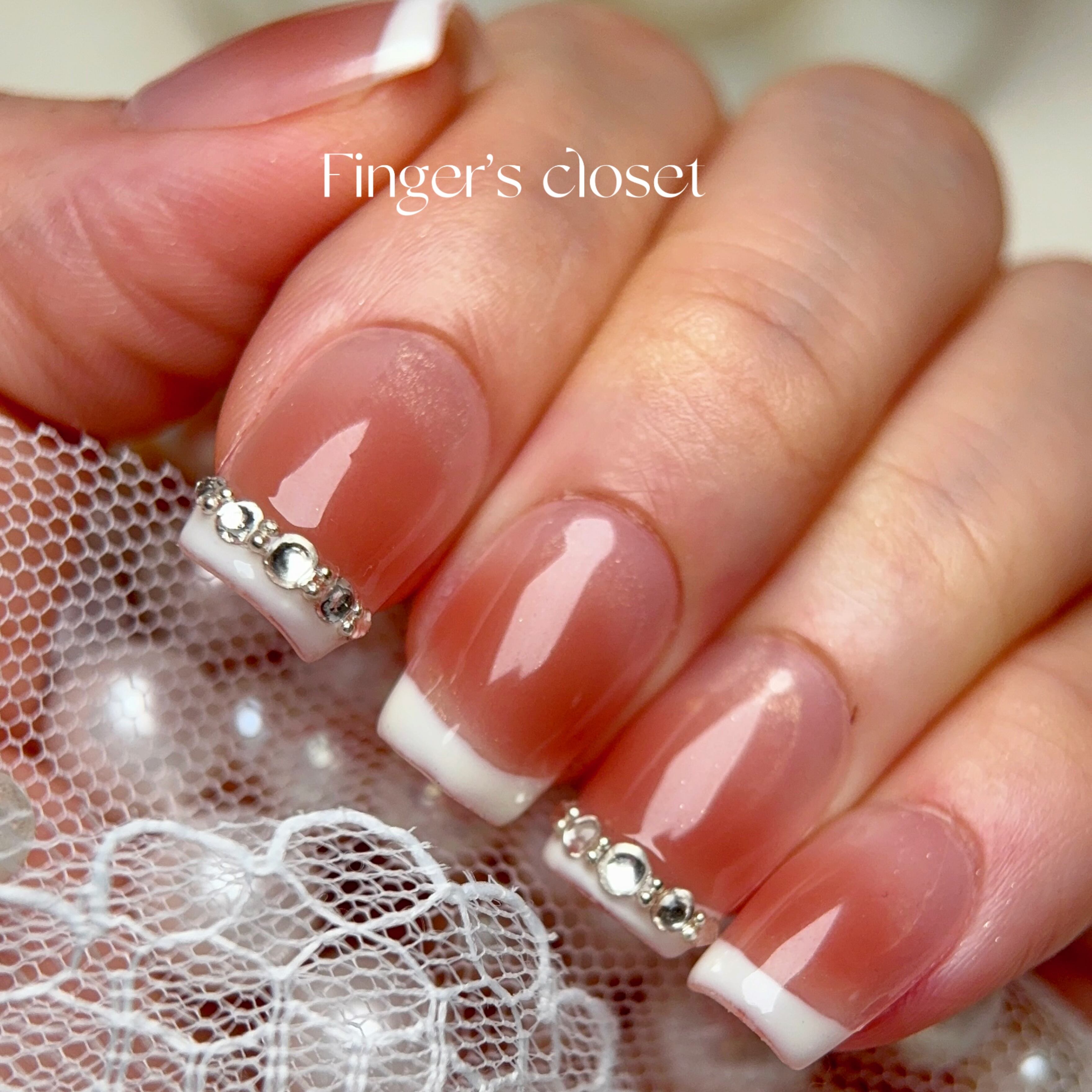 上品で清潔感のあるフレンチホワイトの先端に、きらりと輝くラインストーンを並べた大人のためのクラシカルネイルチップです。