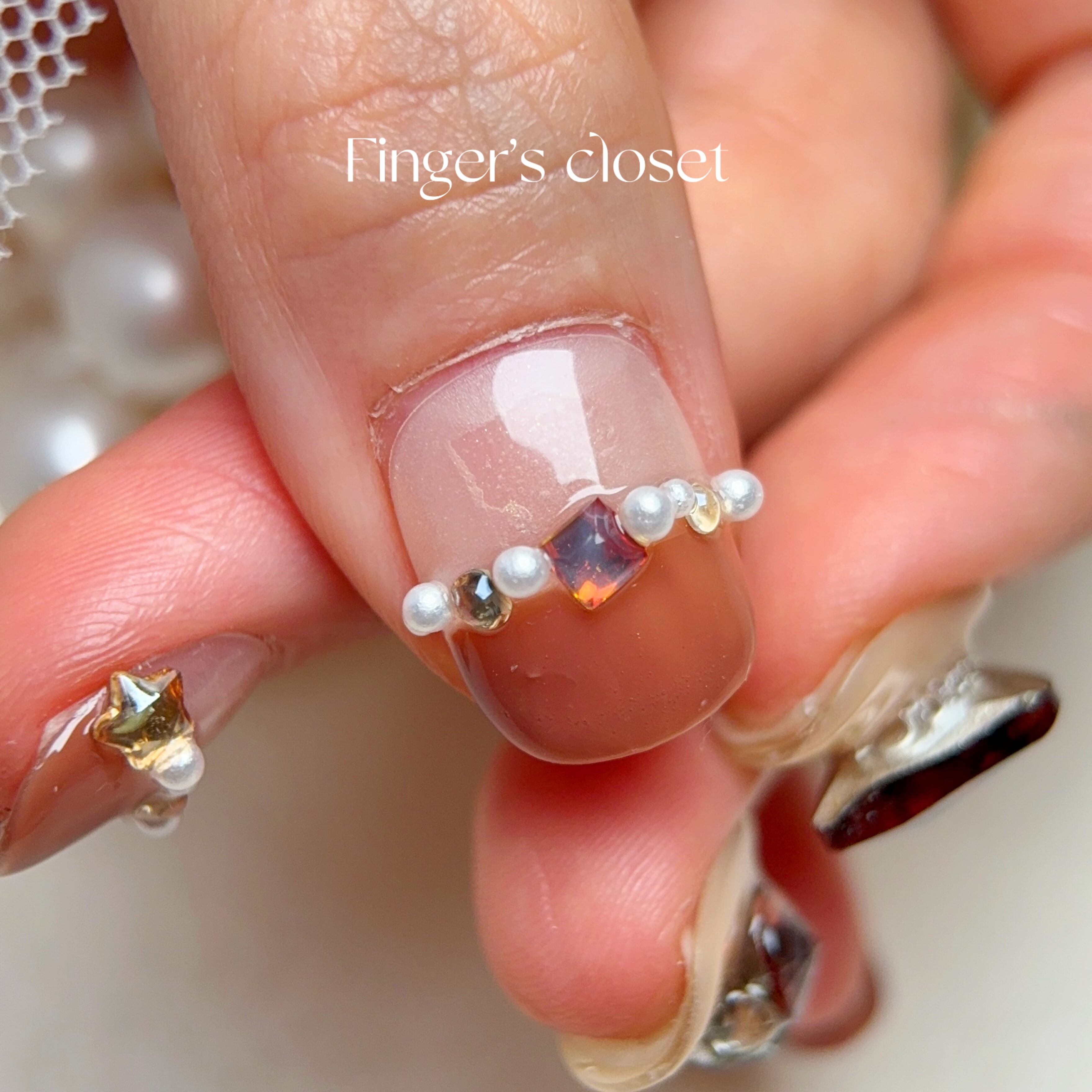 繊細なパールラインとゴールドパーツが上品さを引き立て、程よい可愛さと大人っぽさを兼ね備えたネイルチップです。