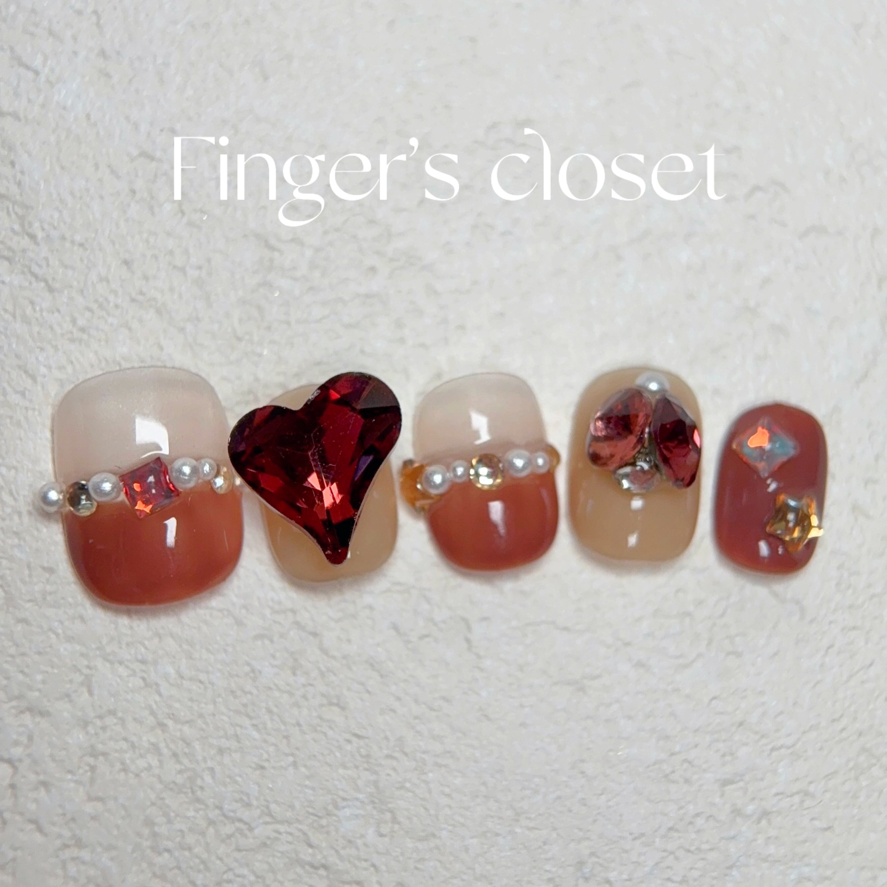 ベージュとブラウンのバイカラーベースに、大粒のレッドハートストーンが印象的なデザイン。