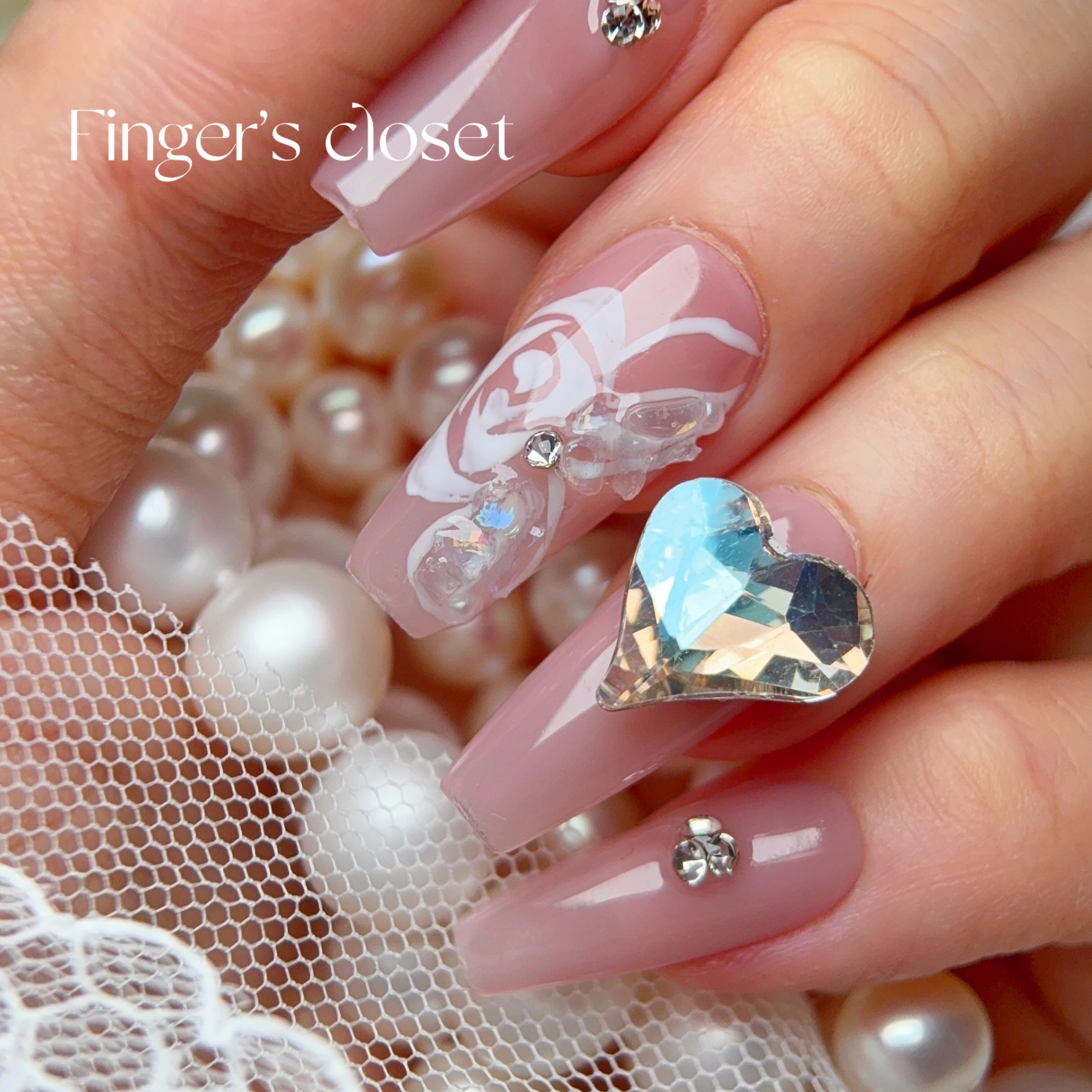 くすみピンク×白バラアート×大粒ハートビジューの上品ネイルチップ バレリーナ ハンドメイドチップ