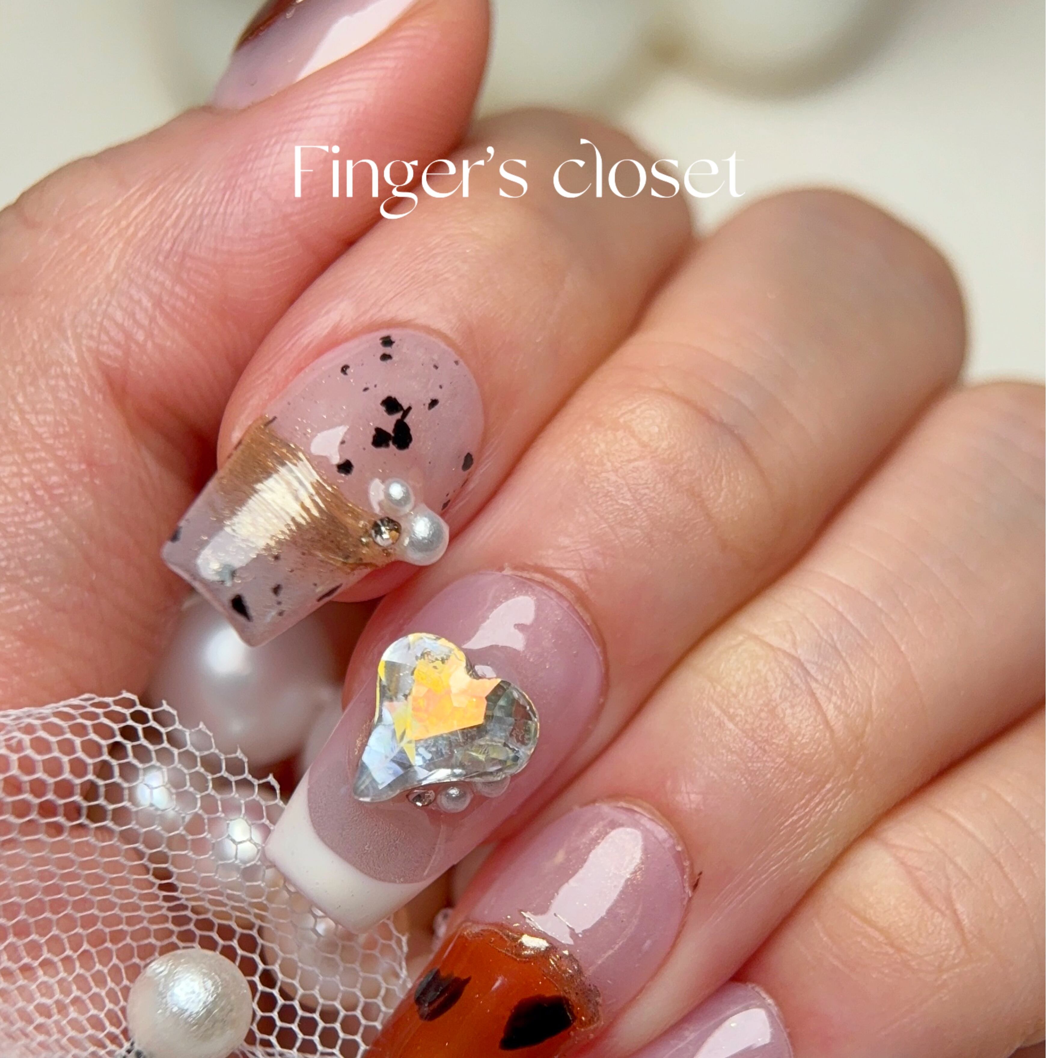 べっ甲ネイルチップ×フレンチ×ハートストーン 個性派オーロラネイル ショートバレリーナ ハンドメイドネイルチップ 韓国ネイル