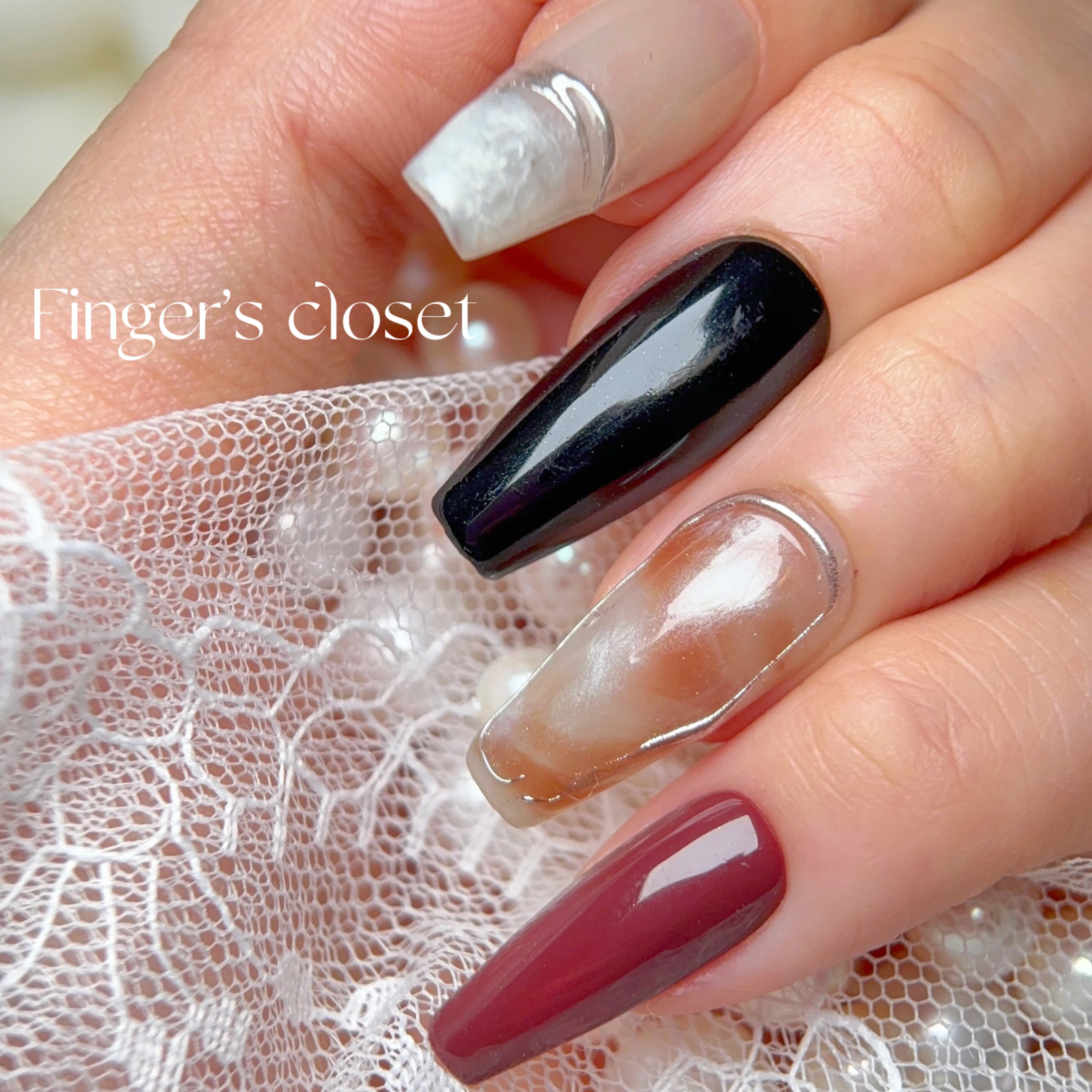 ニュアンスネイルチップ|透け感囲みミラー×ボルドー×ブラックのモードスタイル バレリーナ ハンドメイドネイルチップ ワンホンネイル