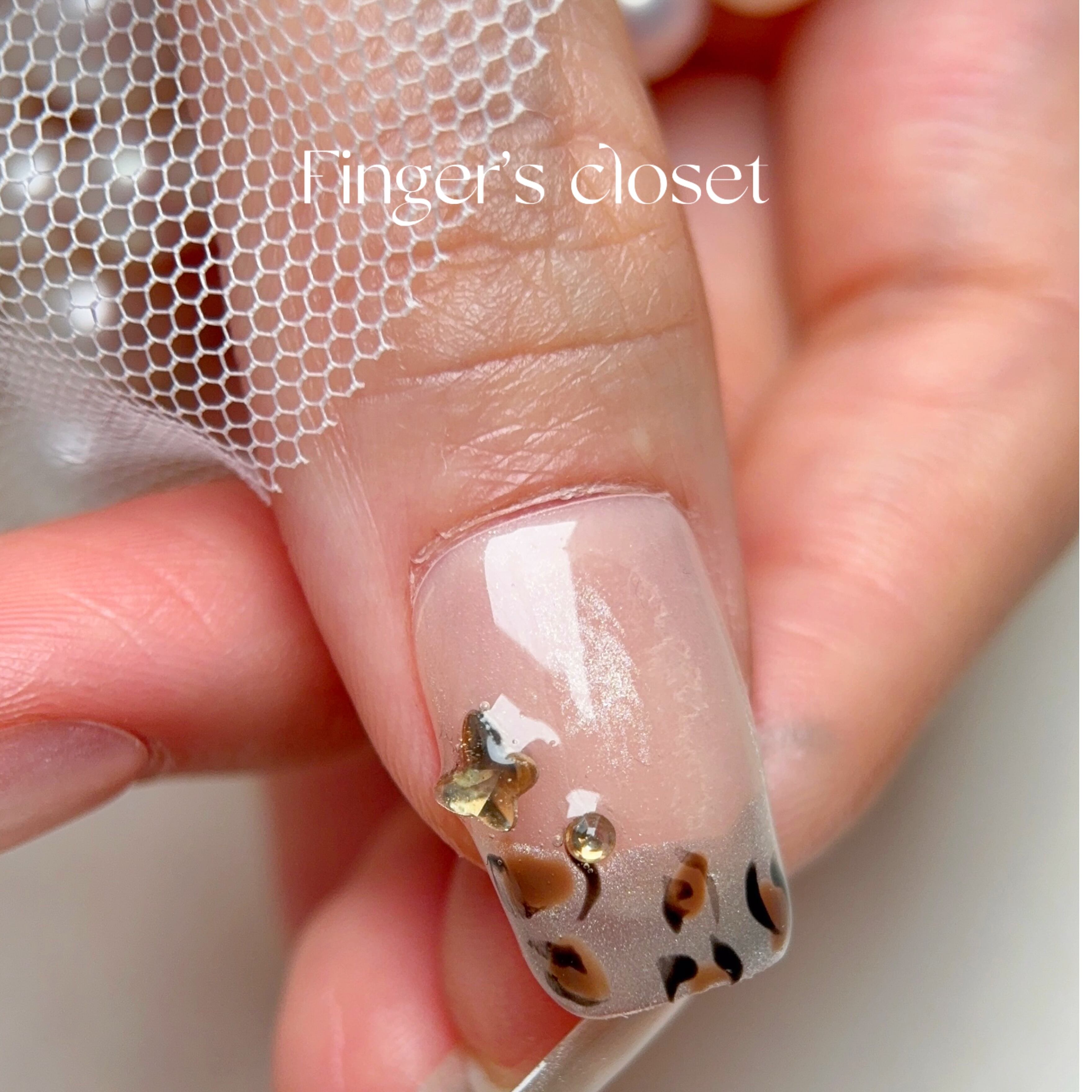 グレージュグラデーションをベースに、レオパード柄とゴールドパーツで仕上げた大人モードなネイルチップ。