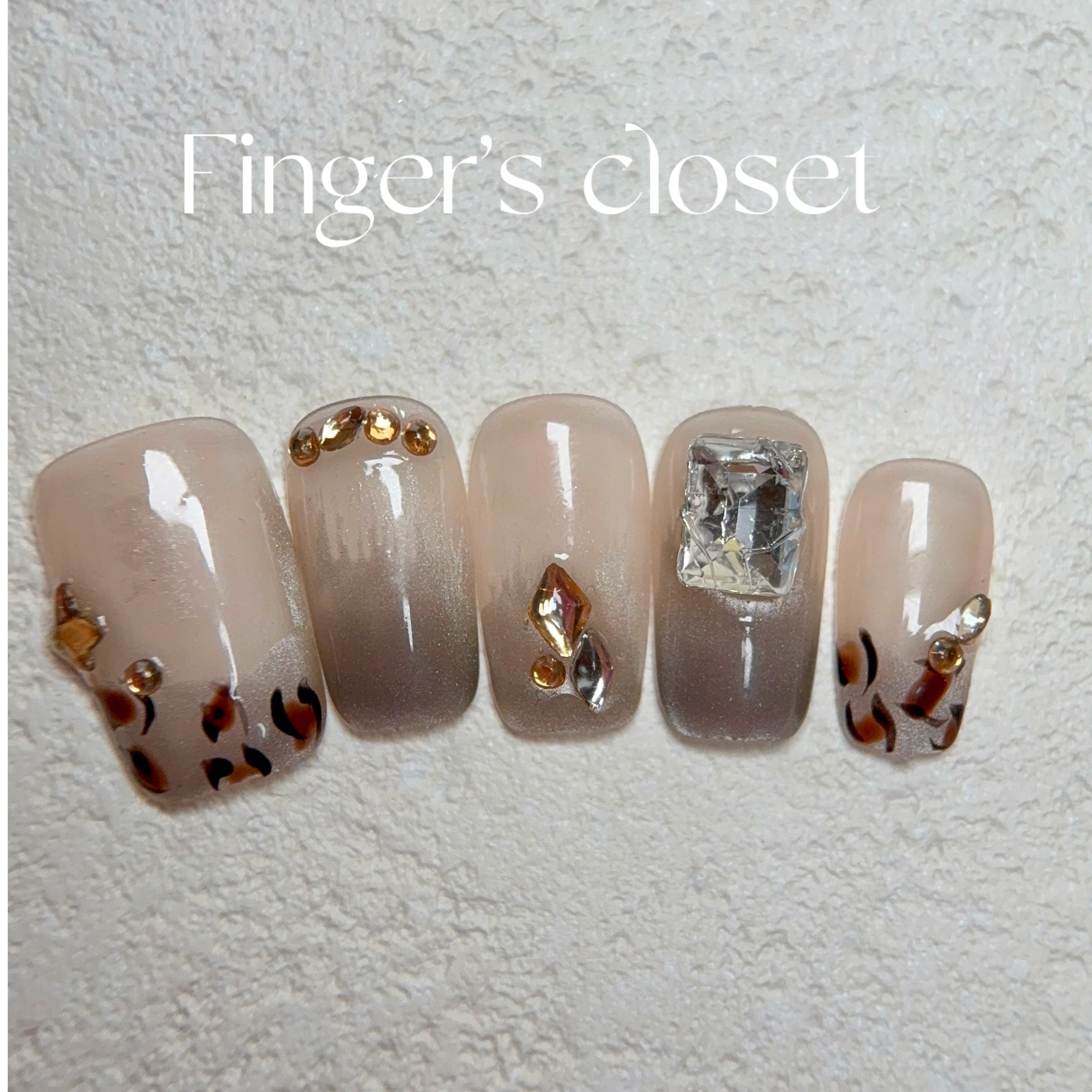 グレージュ×レオパード柄×大粒ビジューの大人モードネイルチップ|ジェルネイルチップ つけ爪 ハンドメイド