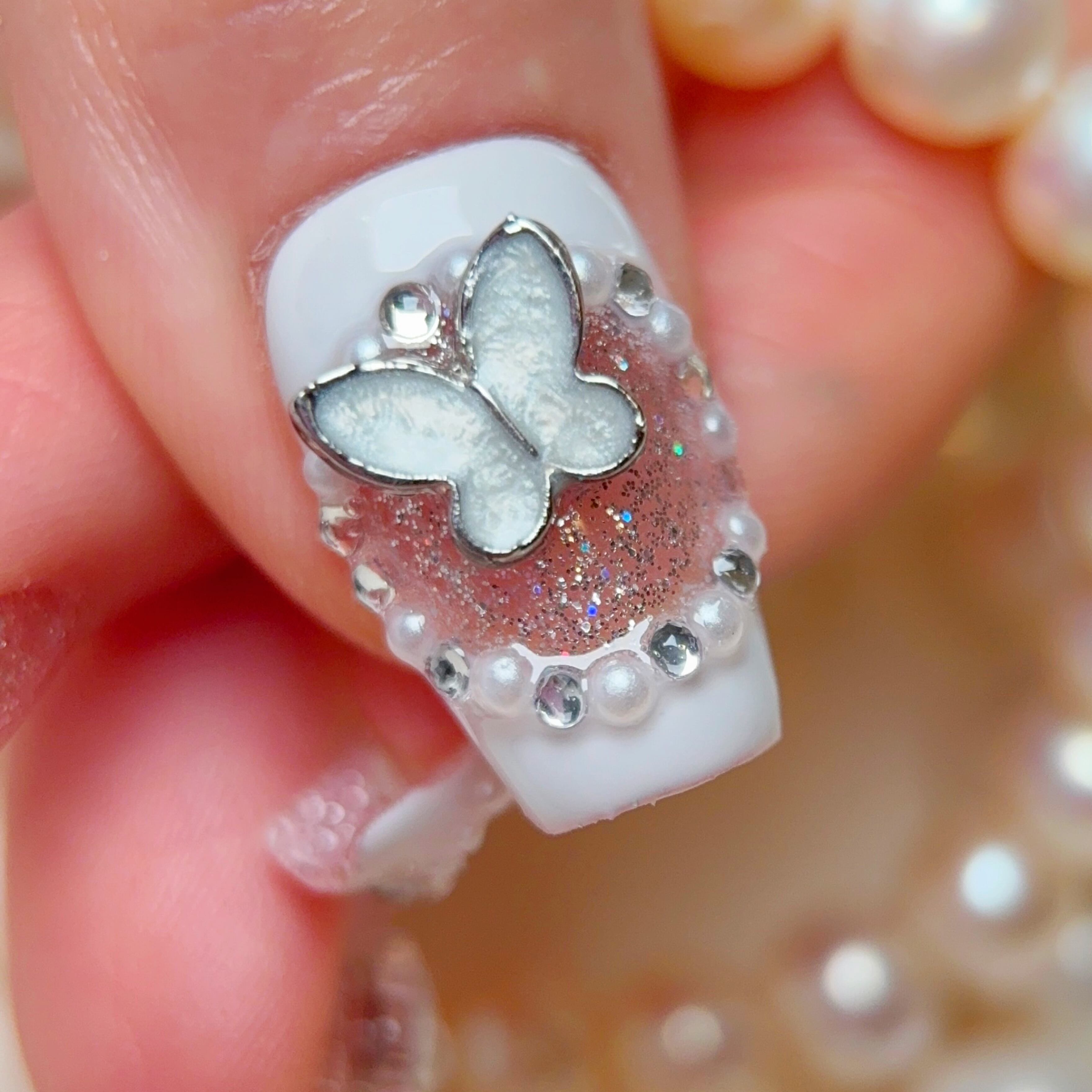 フレンチホワイト×ピンクグリッター×立体バタフライの華やかネイルチップセット|蝶々×パール×ビジュー|ガーリーデザイン|ショップバレリーナ