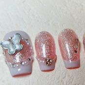 ホワイトフレンチとピンクグリッターが織りなす華やかな輝きに、シルバーの立体バタフライパーツがポイントの上品ネイル。