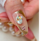 中央には大粒のオーロラストーンとピンクビジューを配置し、アクセサリーのような存在感のあるネイルに仕上げました。