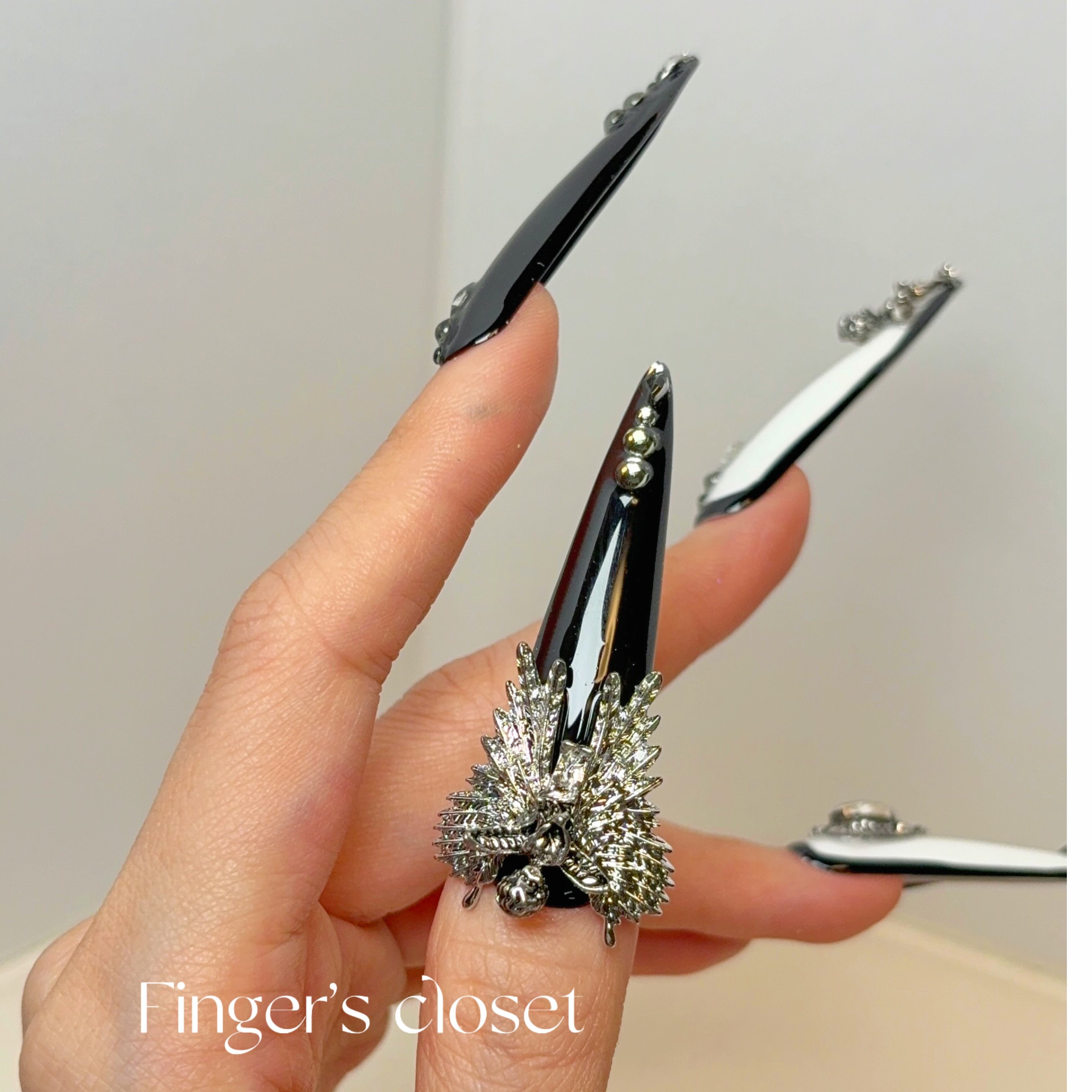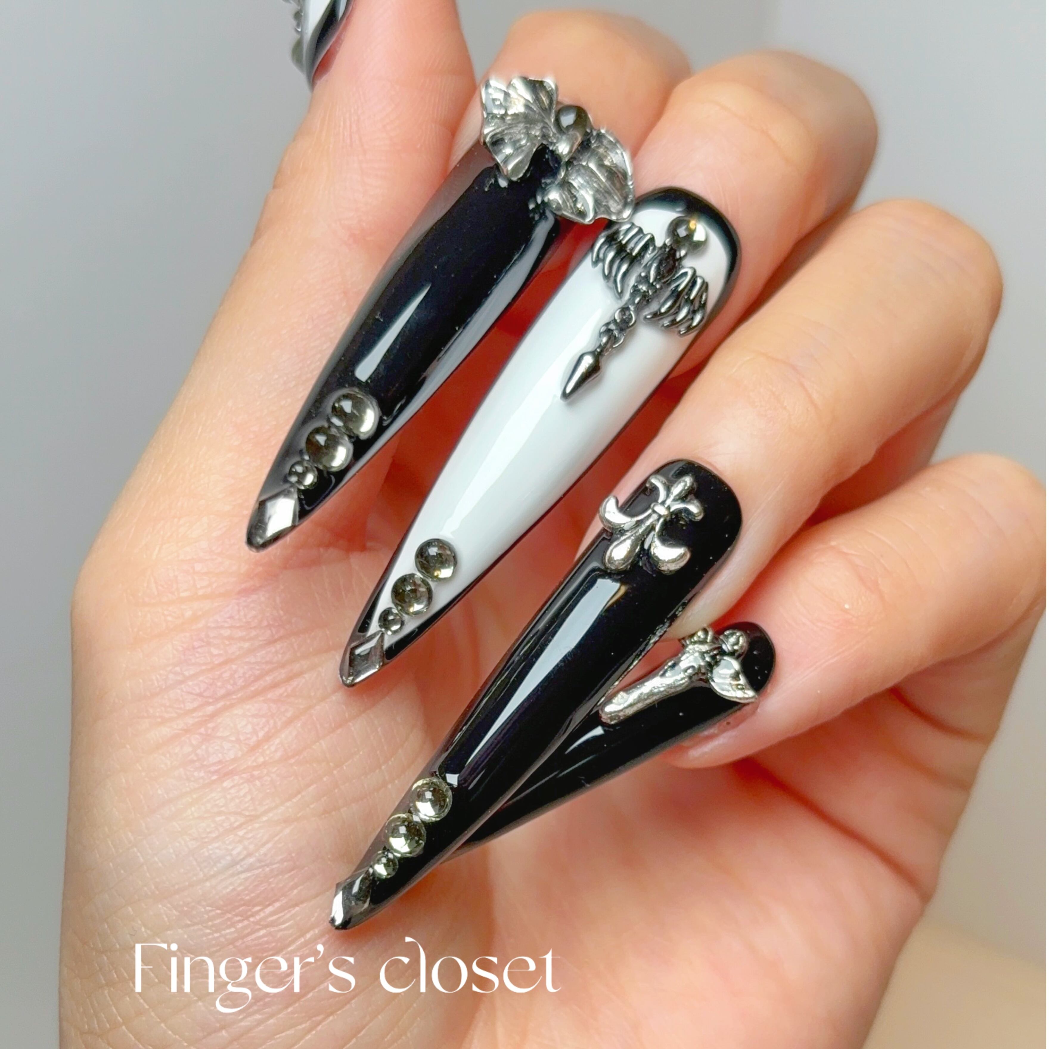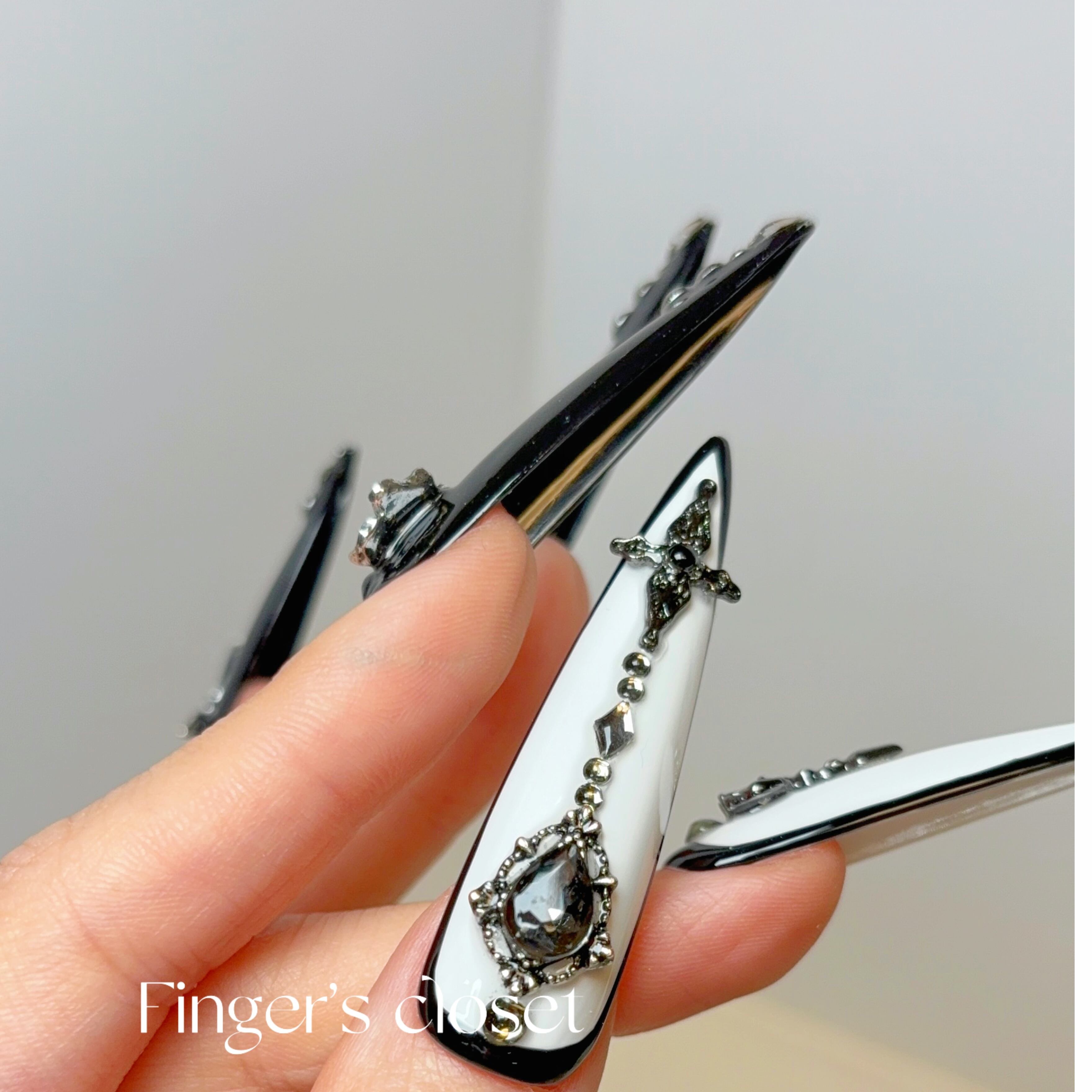 現品ハンドメイド【スーパーロングネイル】ブラック×ホワイト×クローム装飾|天使&ゴシックパーツの韓国中華系ネイルチップ(推し活・ライブ・モード系)