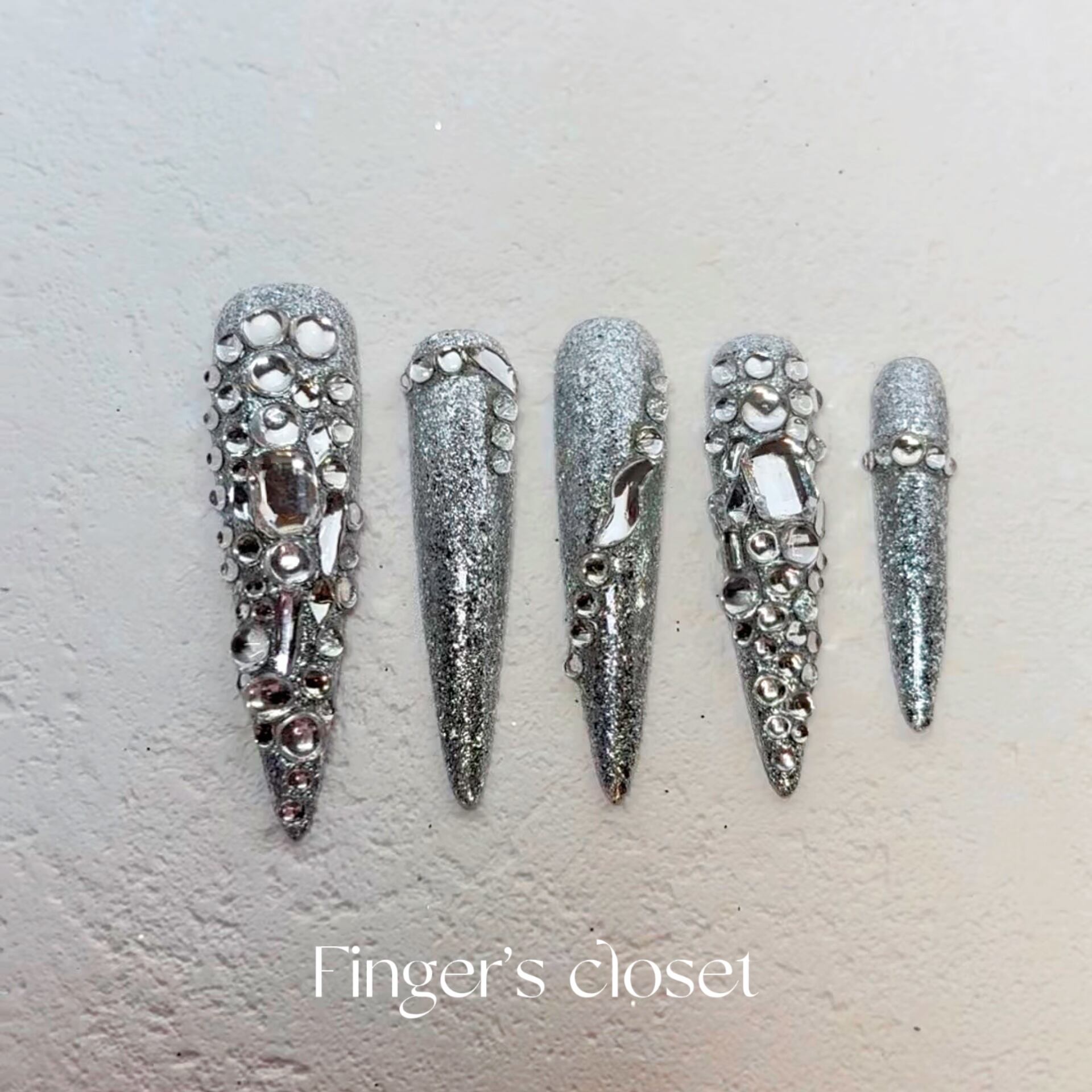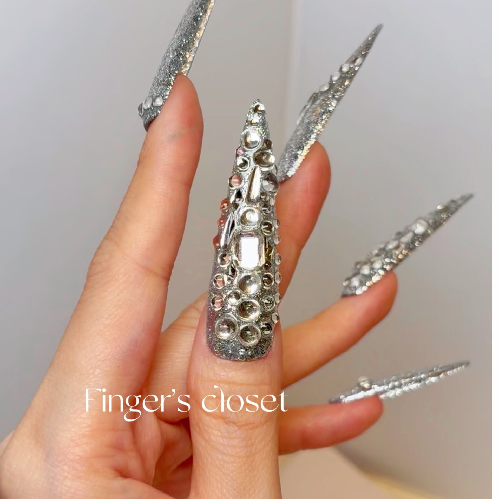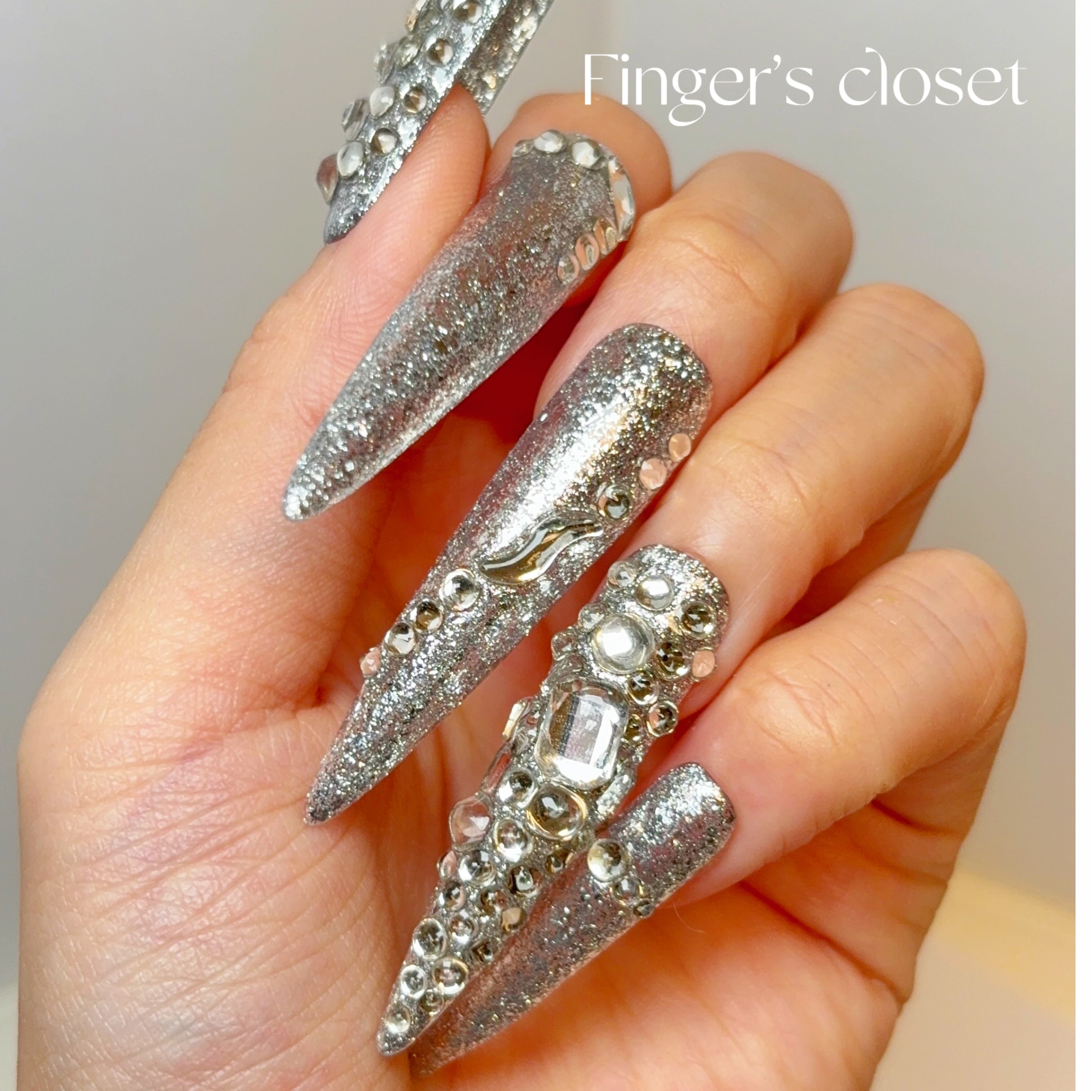 現品ハンドメイド【スーパーロングネイル】シルバーグリッター×立体ビジューアート|韓国中華系きらめきネイルチップ(推し活・ライブ・ドレスアップ)