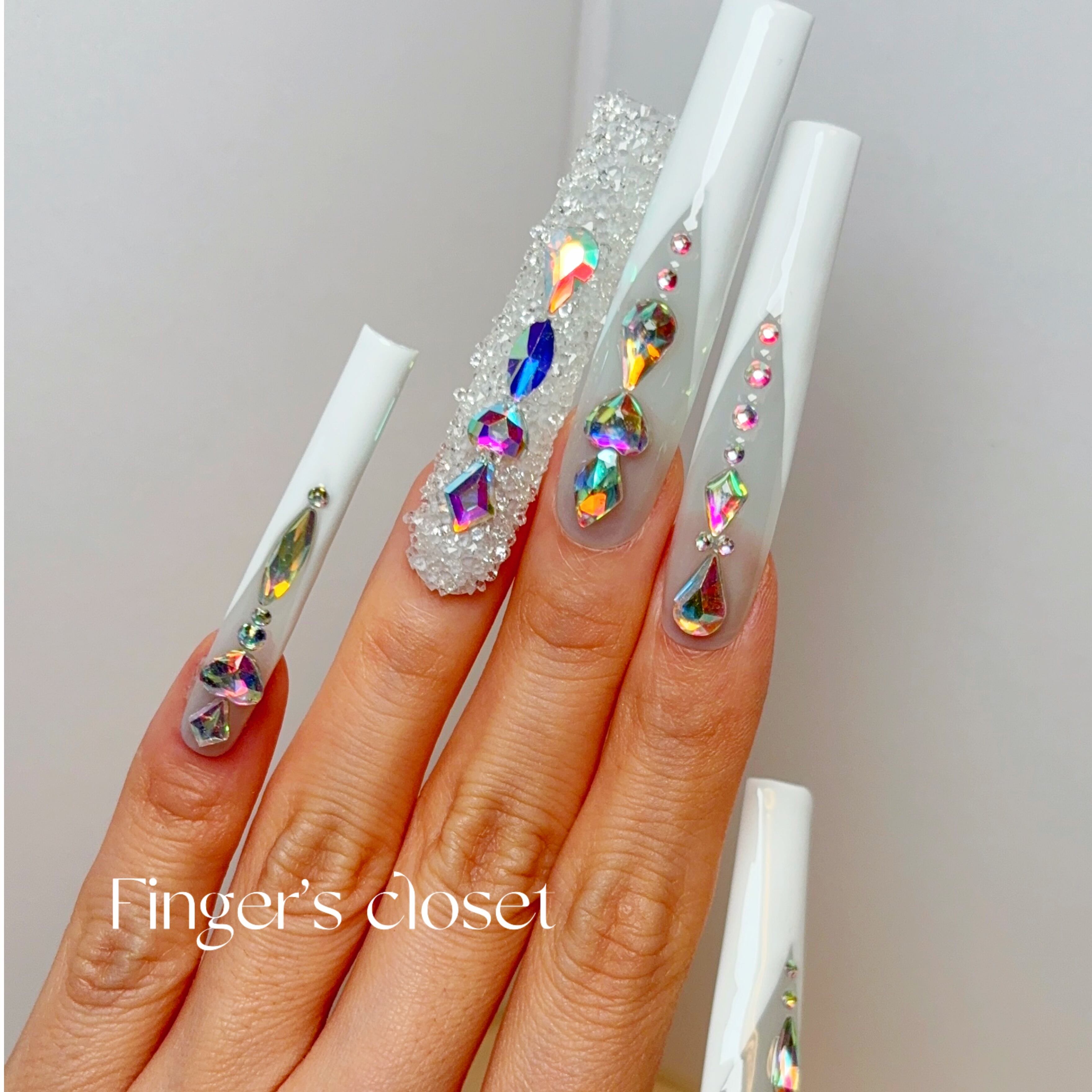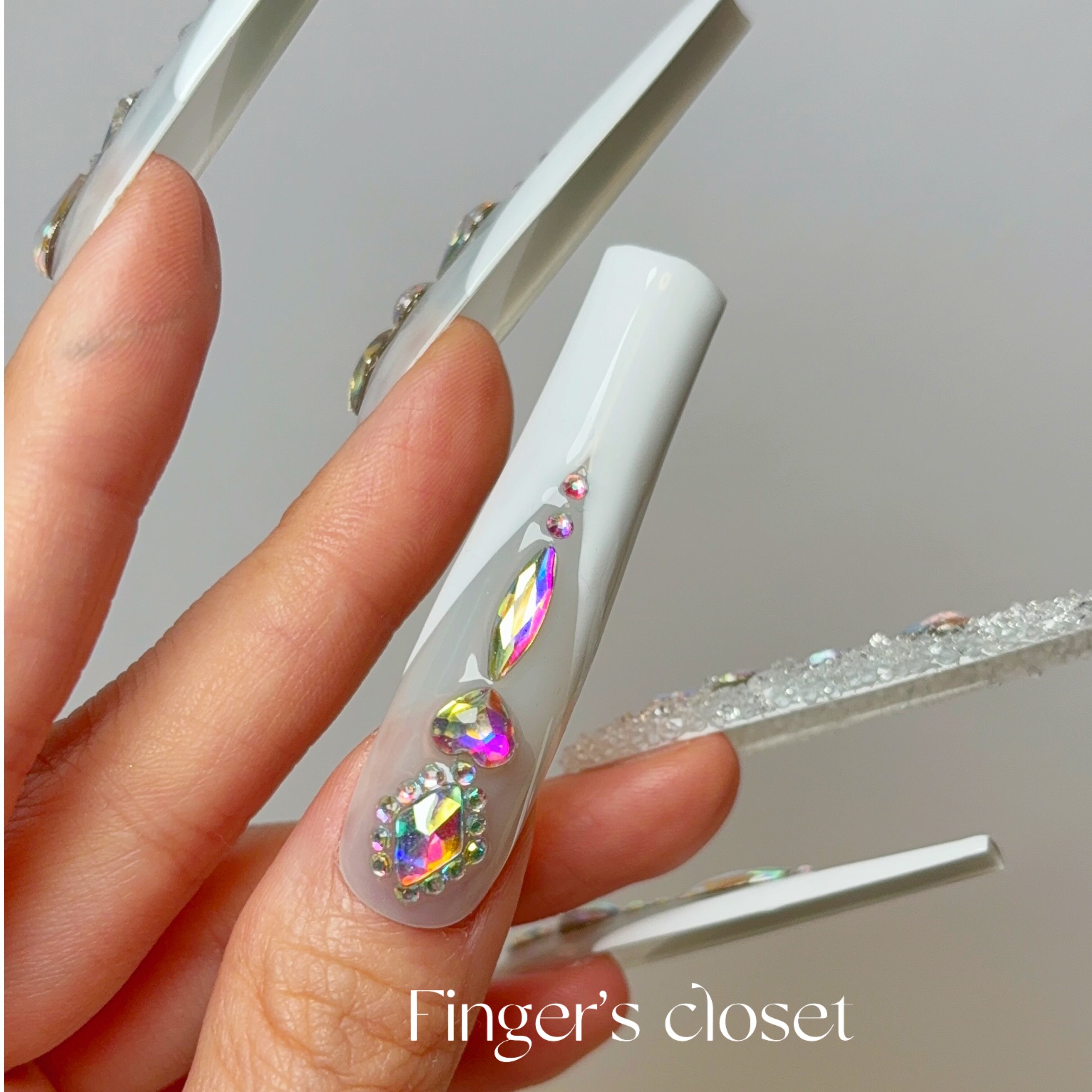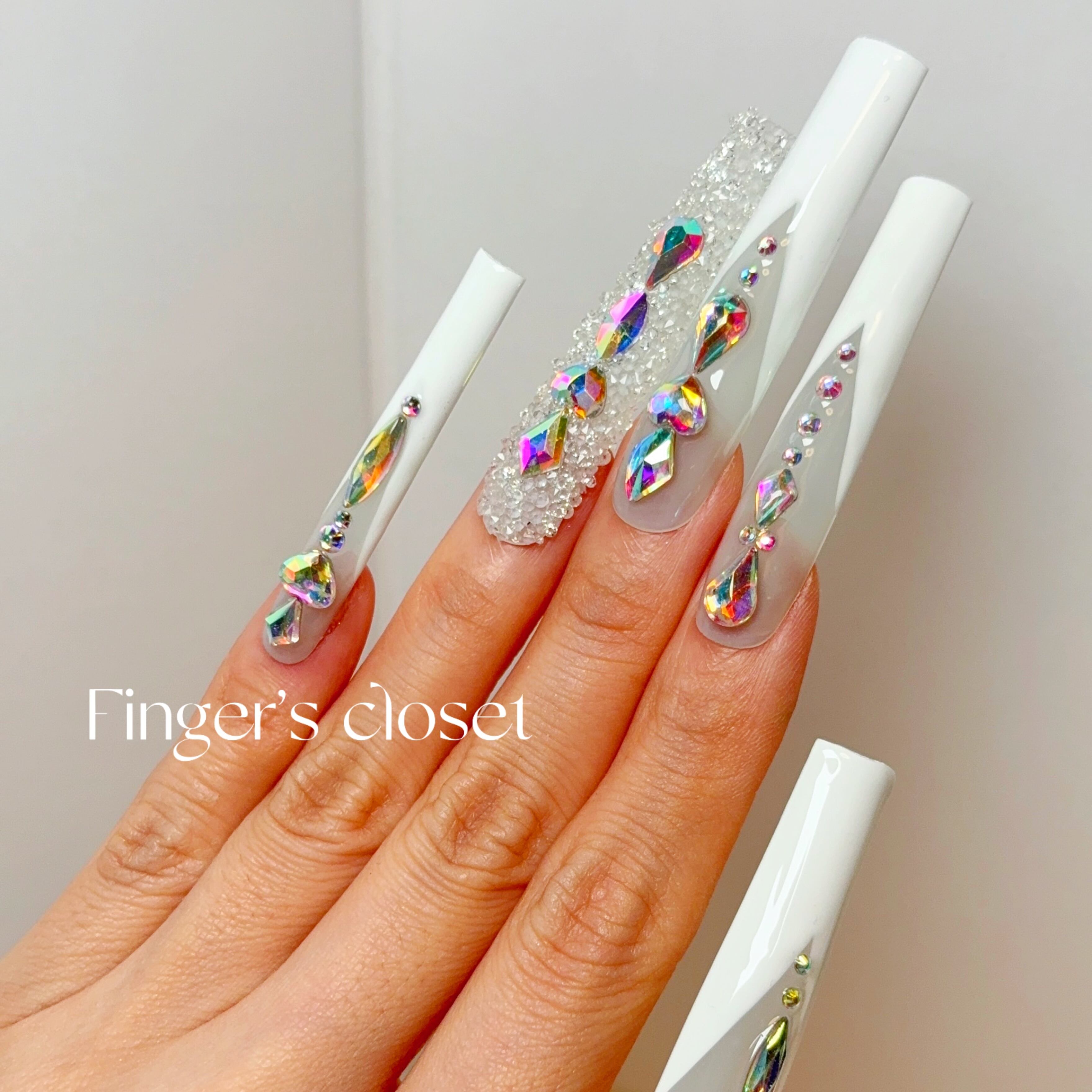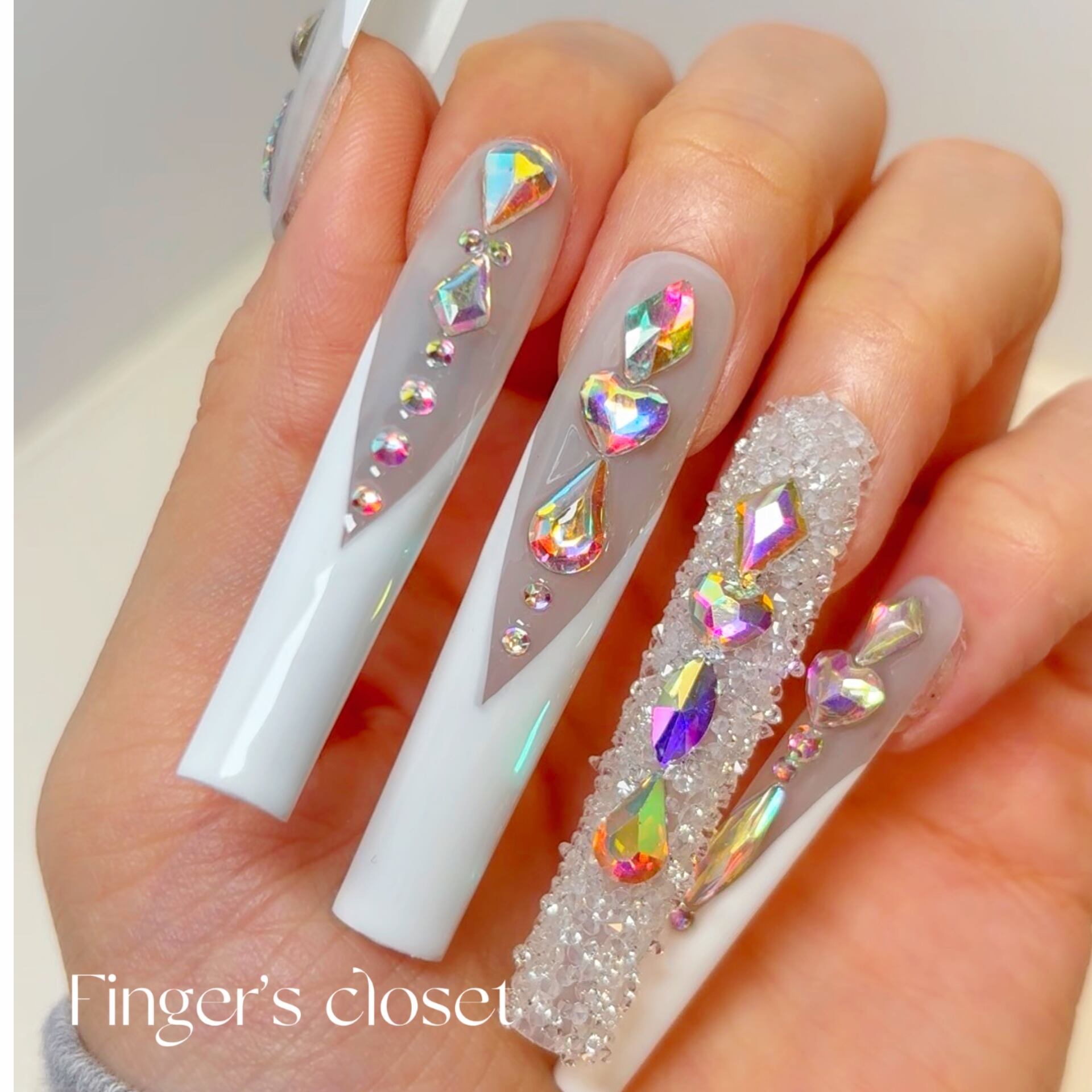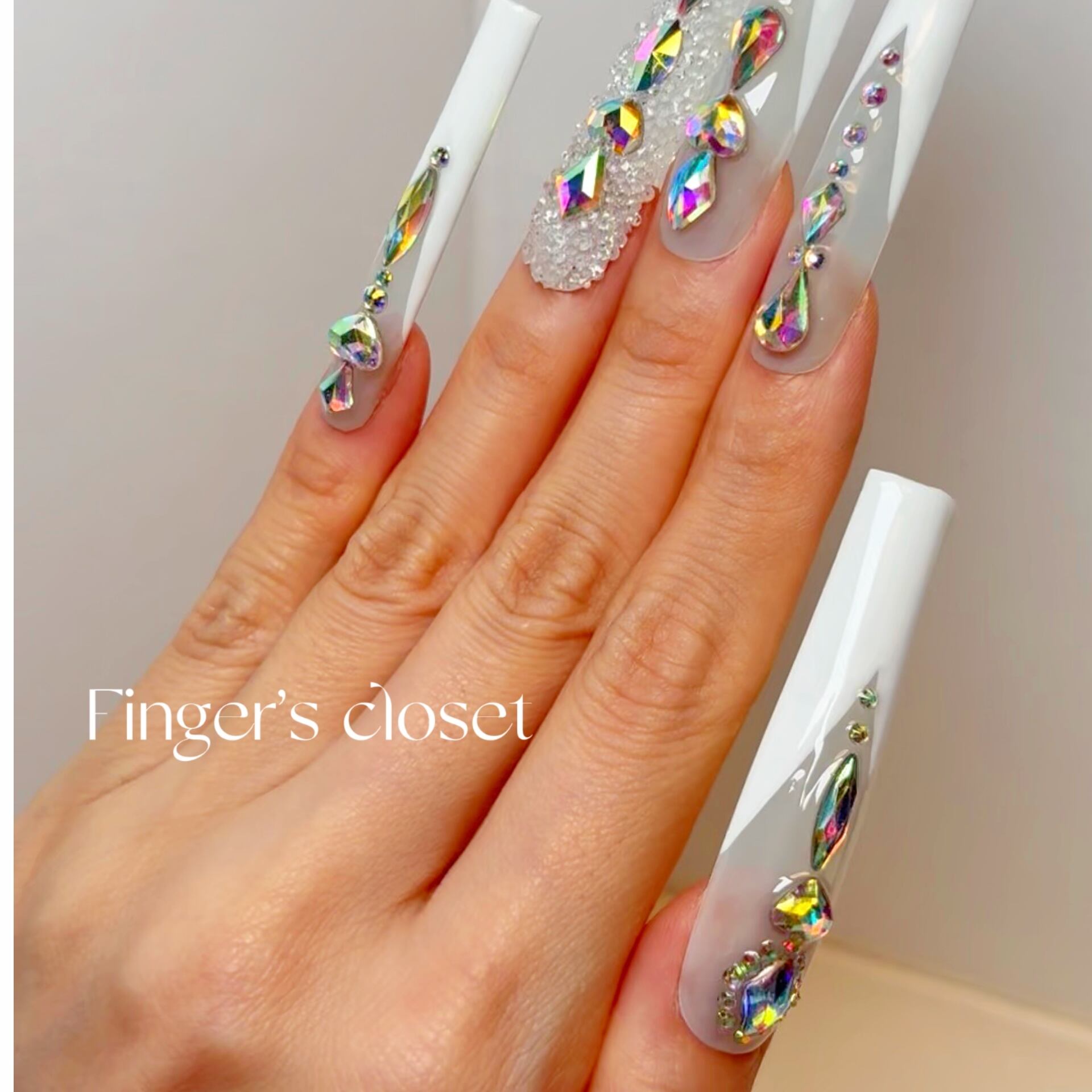 現品ハンドメイド【スーパーロングネイル】ホワイトベース×クリアビジュー×オーロラストーン|韓国中華Y2K映えネイルチップ(推し活・ステージ・セルフ撮影)