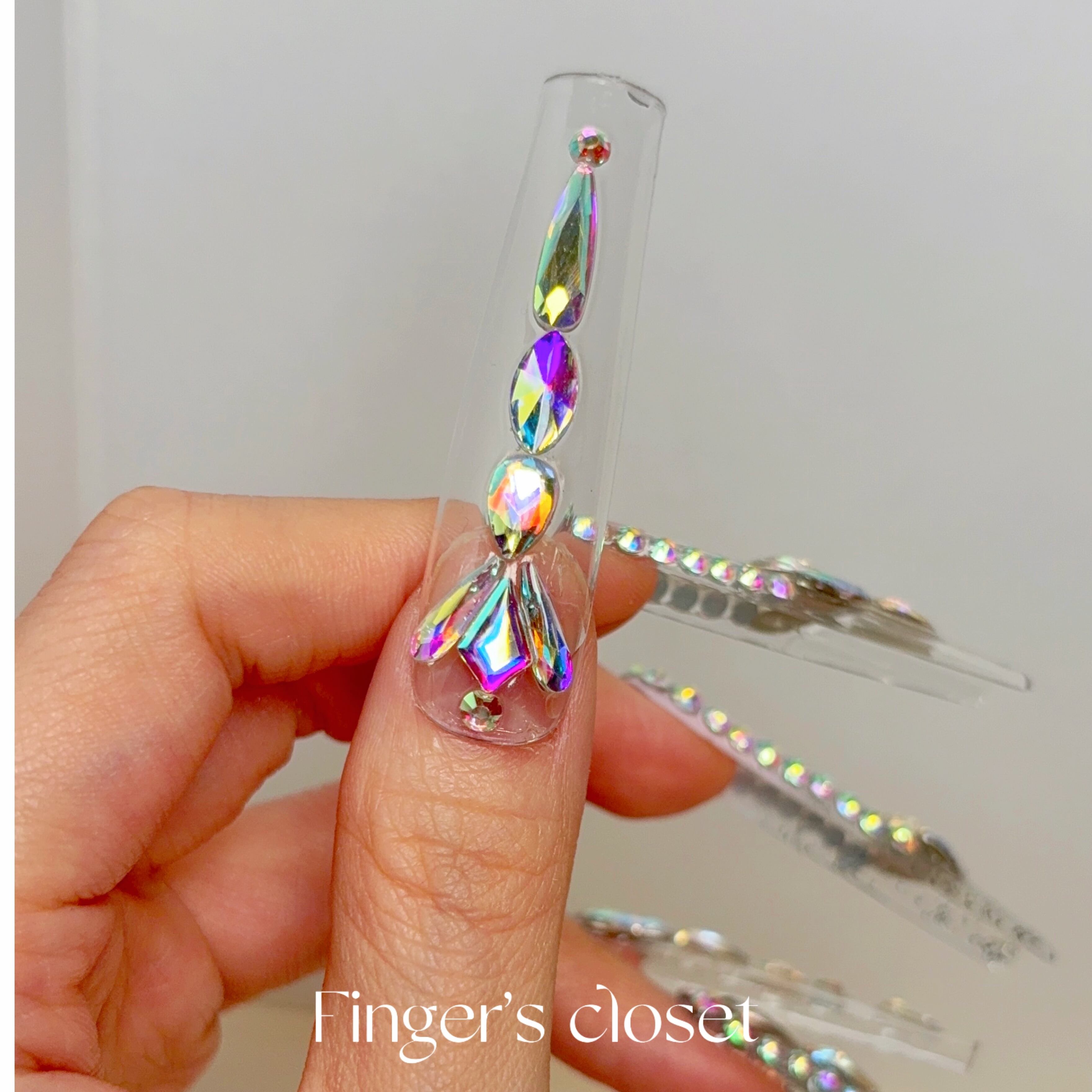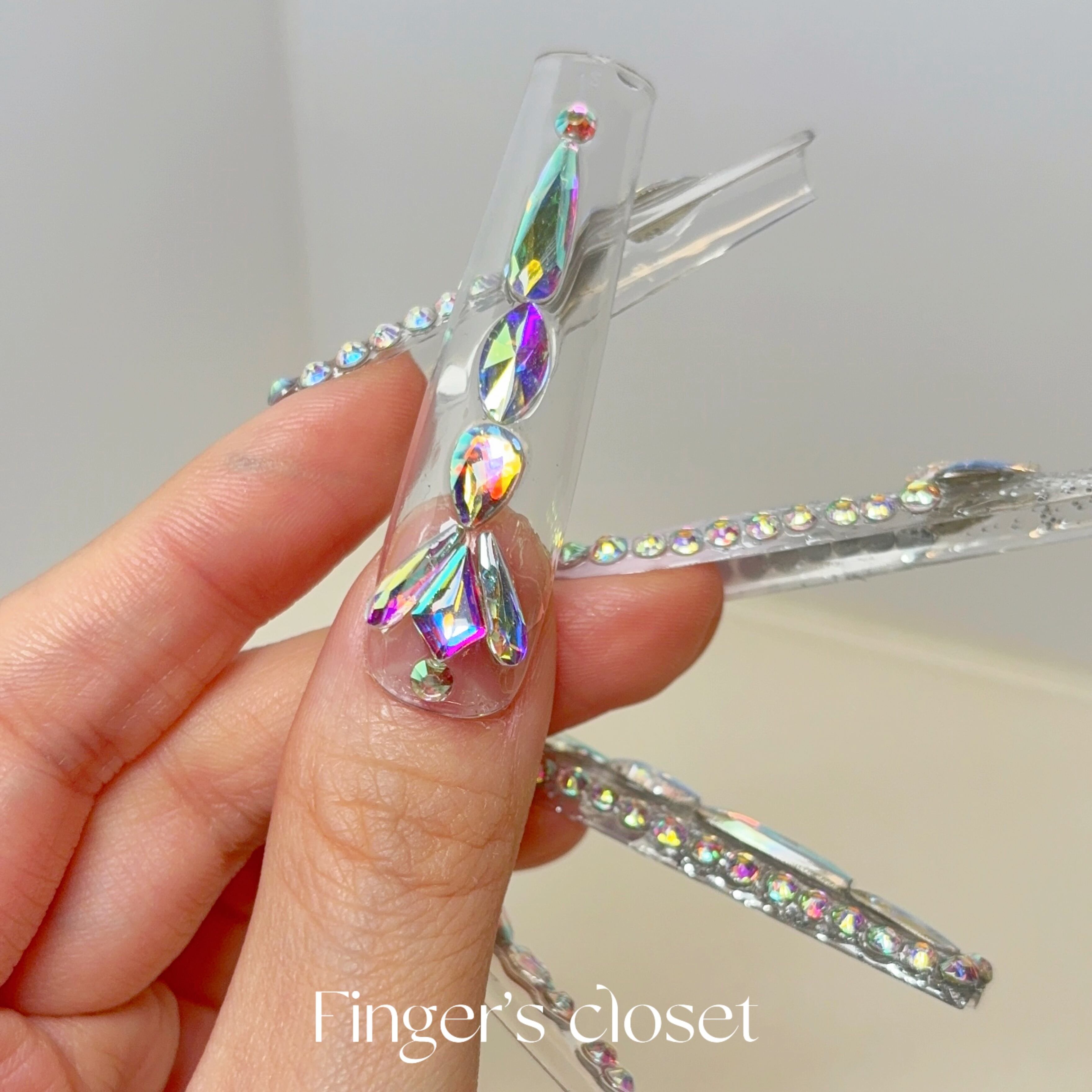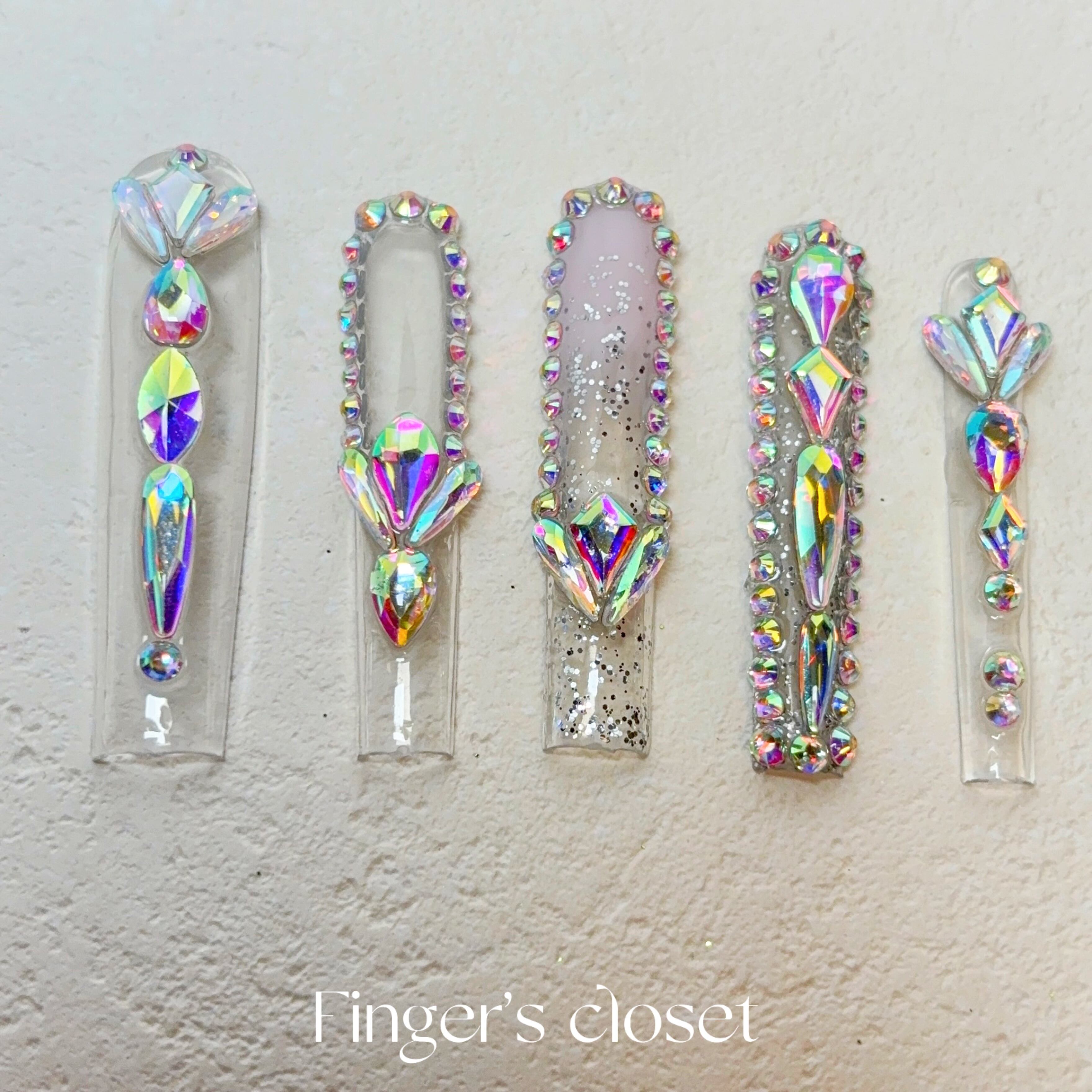 特大オーロラビジュー×フレームライン×クリアベースのスーパーロングネイルチップ|Y2K×韓国系派手デザイン