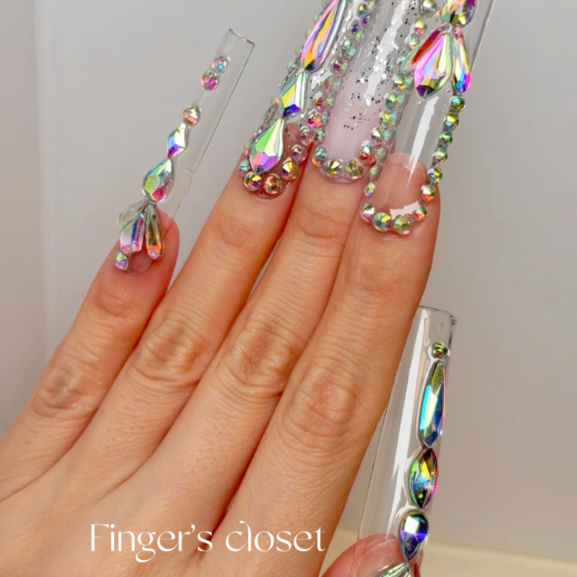 透明感のあるクリアベースに、眩いオーロラストーンと煌めくビジューラインをたっぷり配置した、圧倒的存在感のスーパーロングネイル。