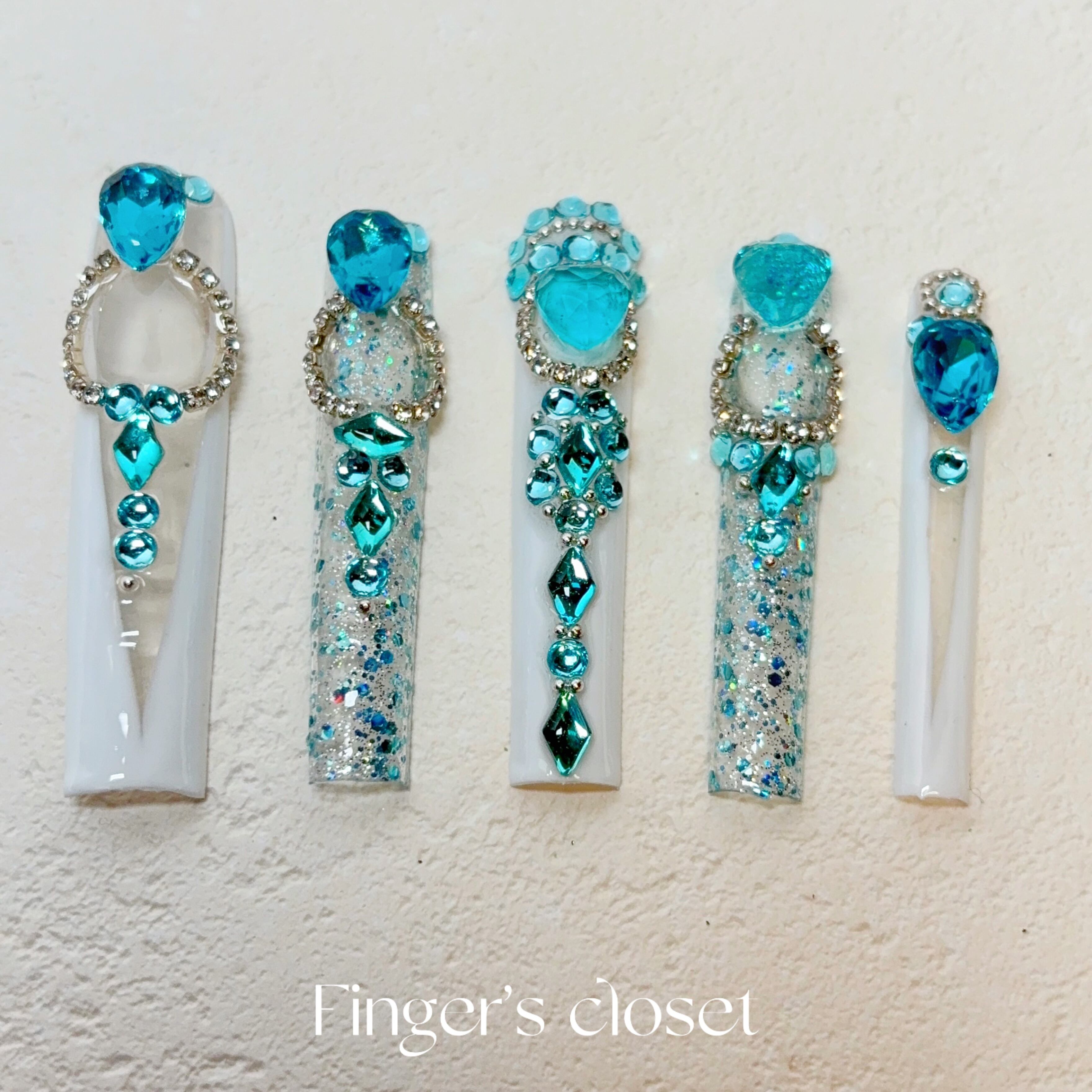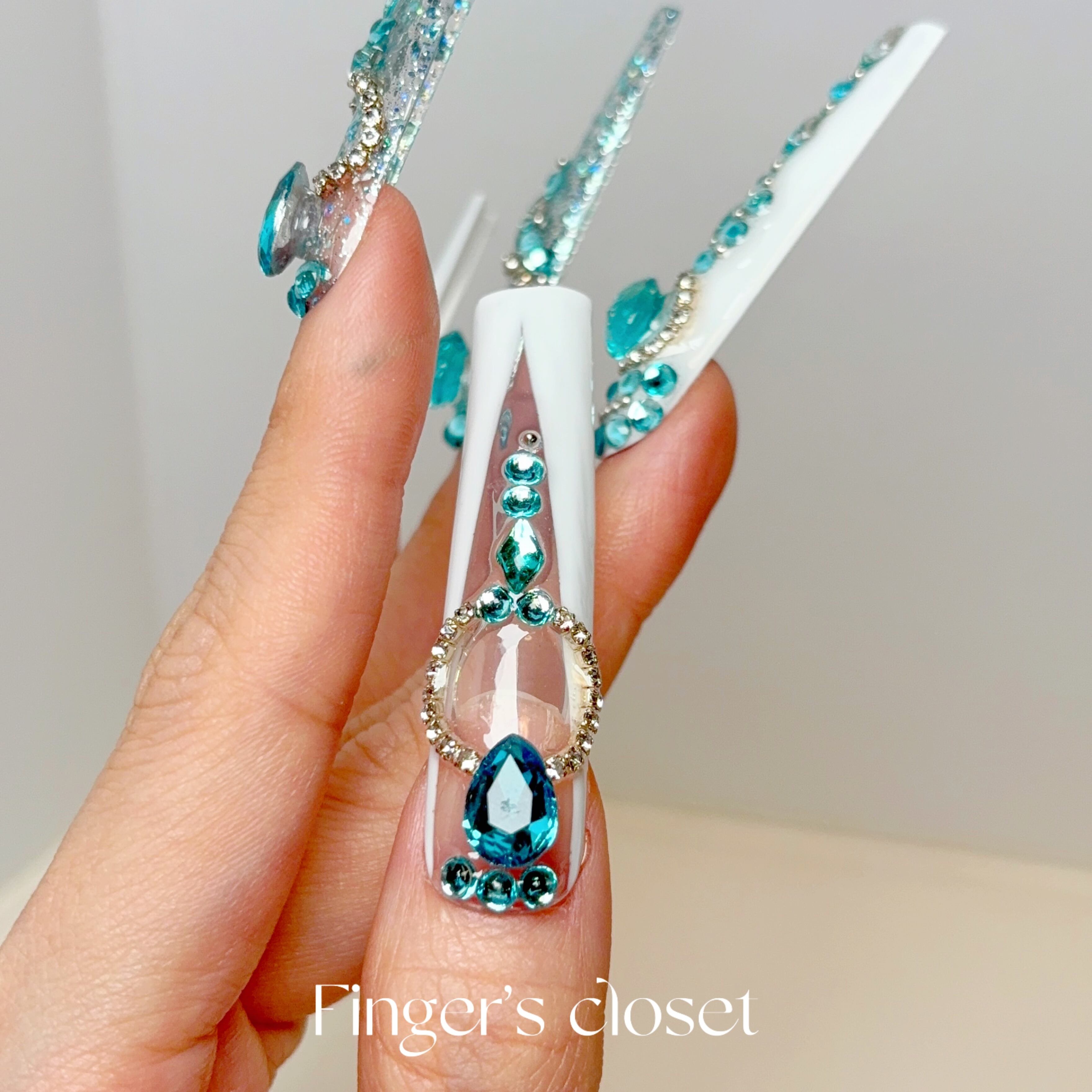 ホワイト×ジュエリーストーン×クリアベースのスーパーロングネイルチップ 韓国風デザイン