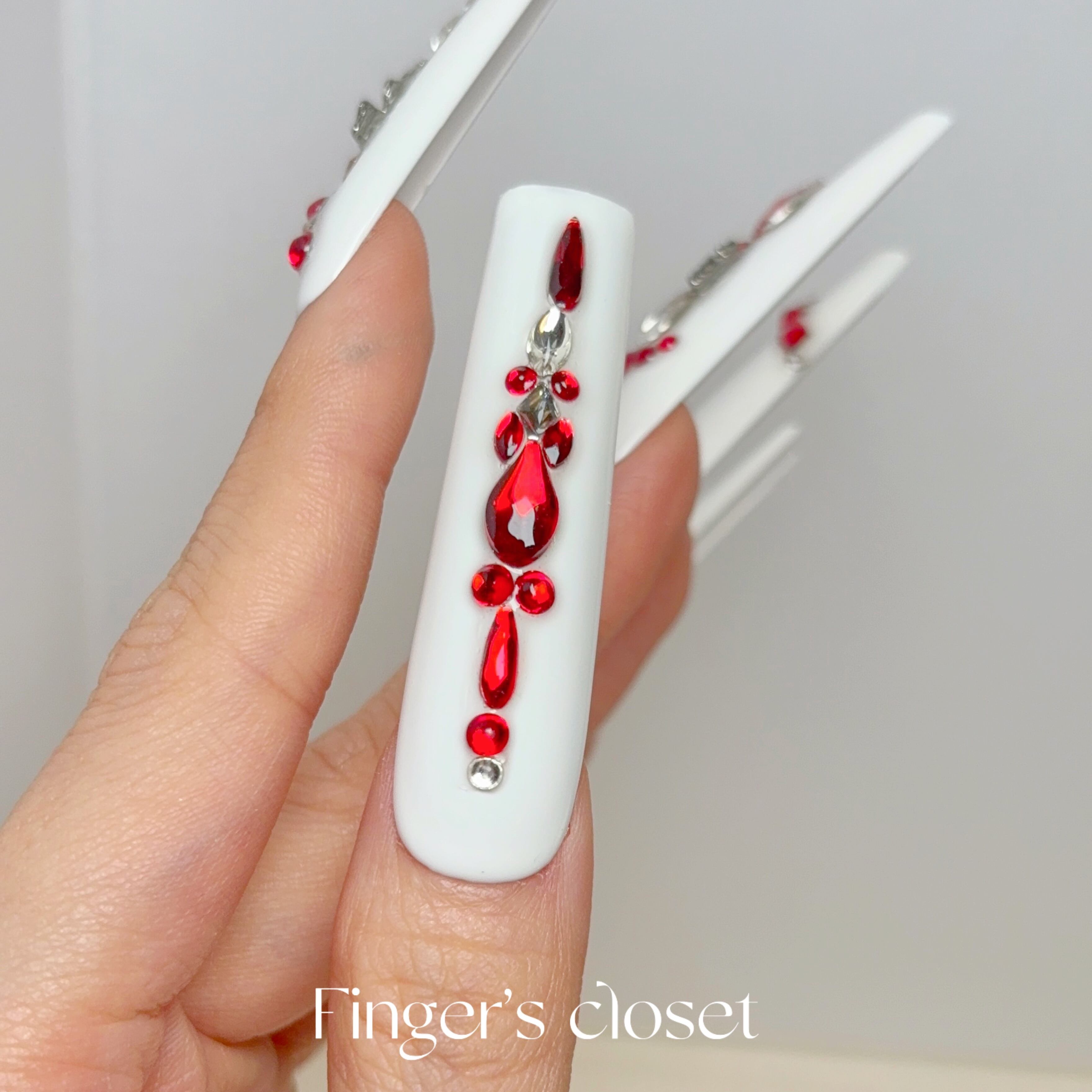 ホワイト×レッドビジュー×蝶々のラグジュアリー超ロングネイルチップ 韓国中国ファッション風