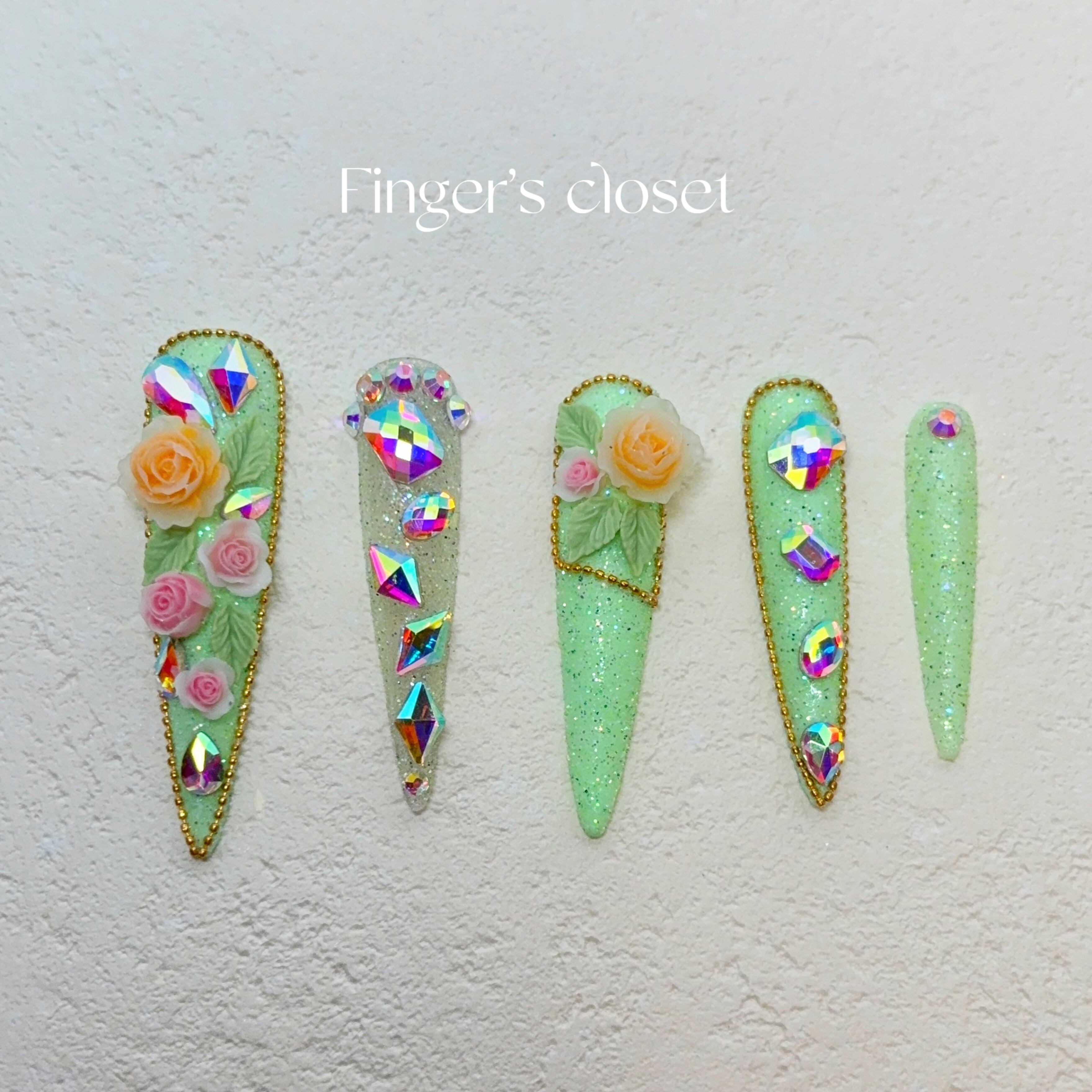 ライトグリーンのグリッターとミントカラーのバイカラーをベースに、立体ローズと煌めくビジューを贅沢に配置したジュエリー風ネイルチップ。