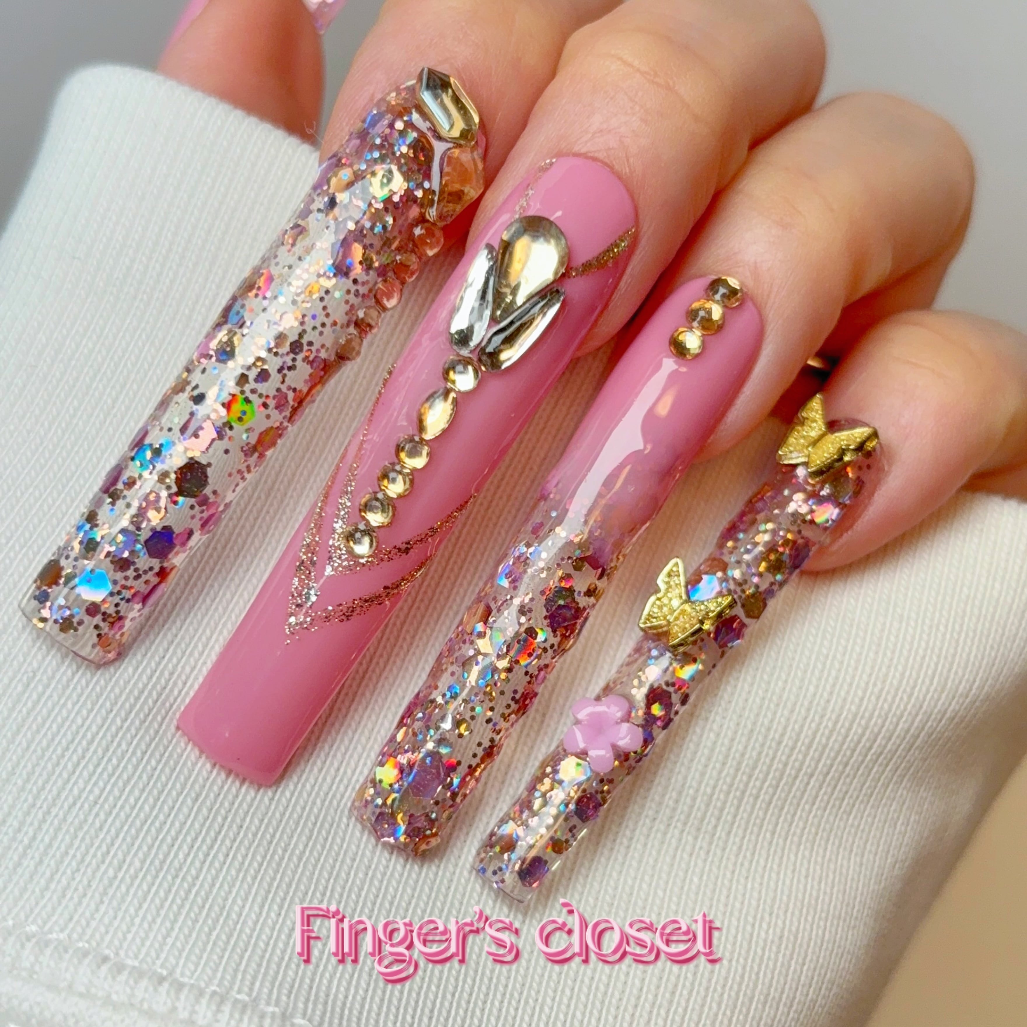 ピンクグリッター×ジュエリービジュー×ゴールドリーフの華やかネイルチップ|韓国風ジェルチップ|Y2Kロングネイル