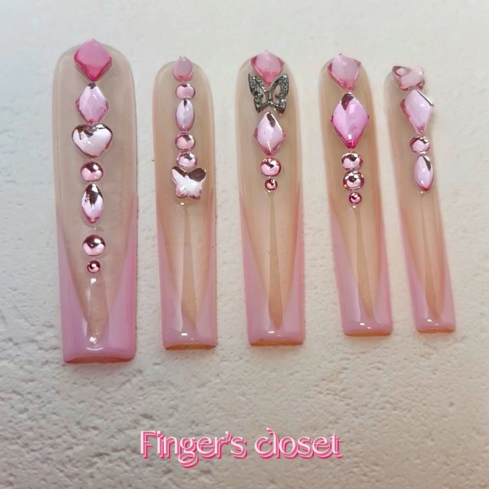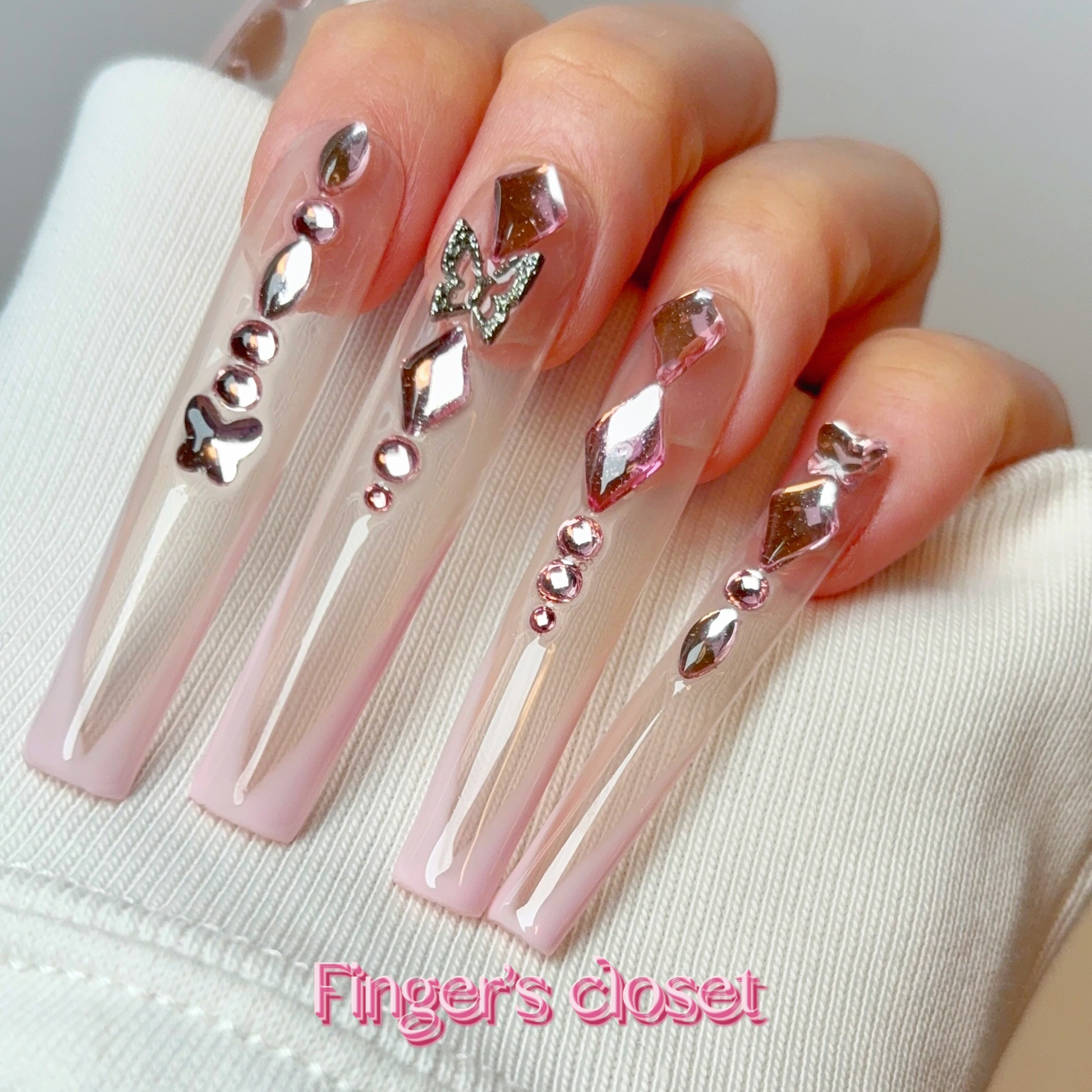 うるツヤクリア×ピンクミラー蝶々パーツ付きネイルチップセット|ギャルネイル|Y2K|スーパーロング✨