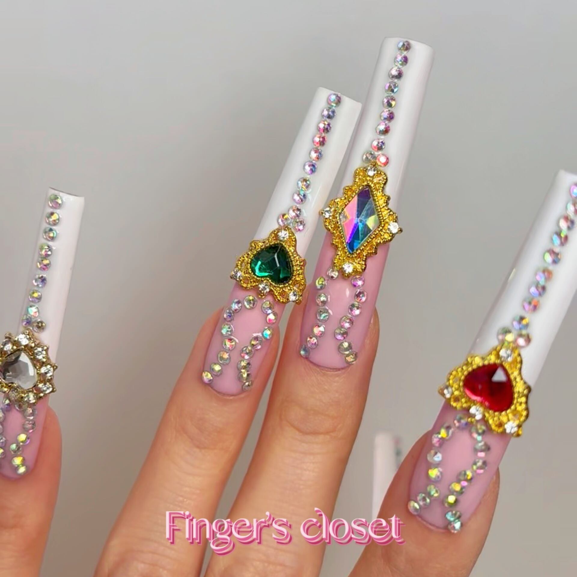 セーラームーン風ジュエリーネイルチップ ホワイト×ピンクベース×カラーストーン×100粒ビジュー付き✨スーパーロング